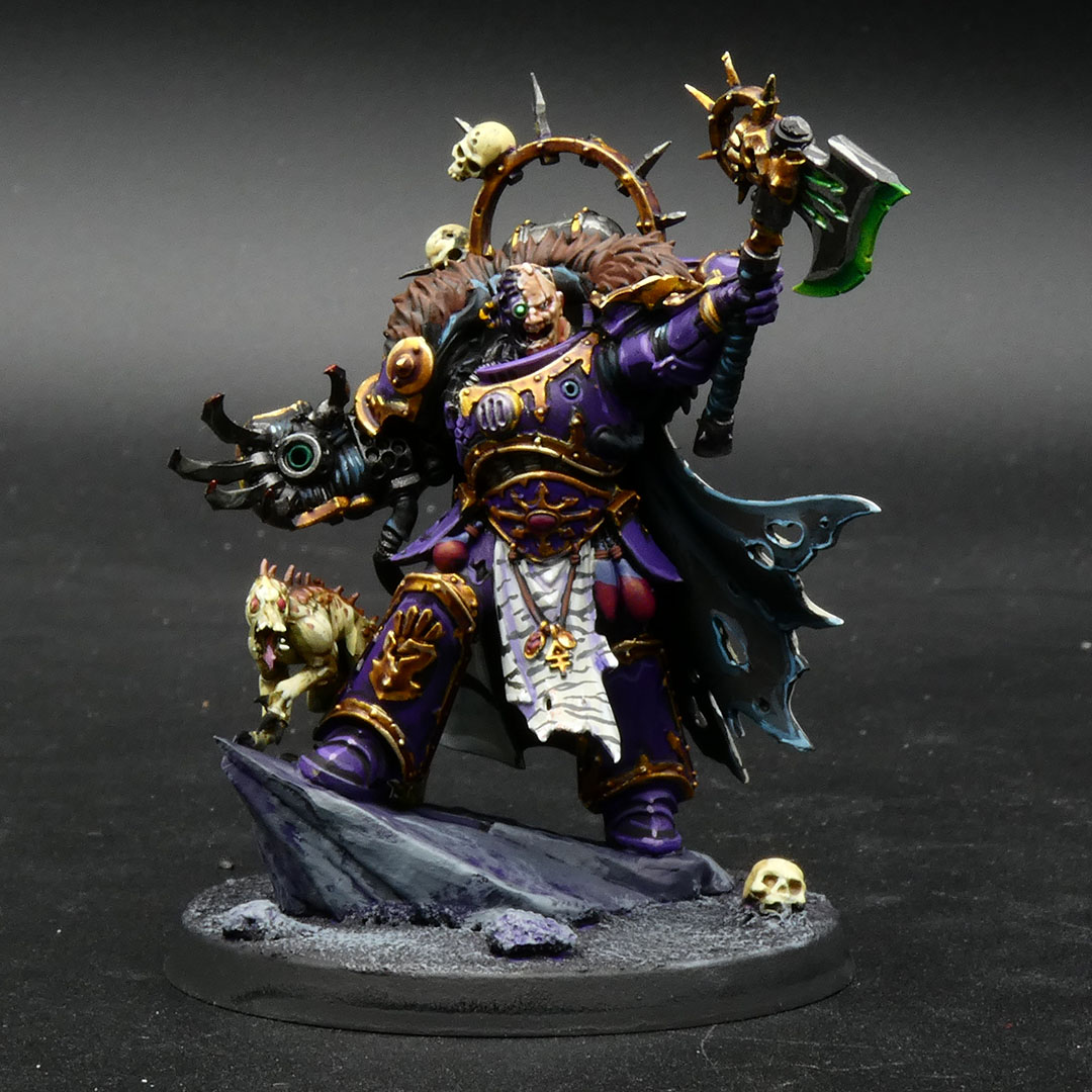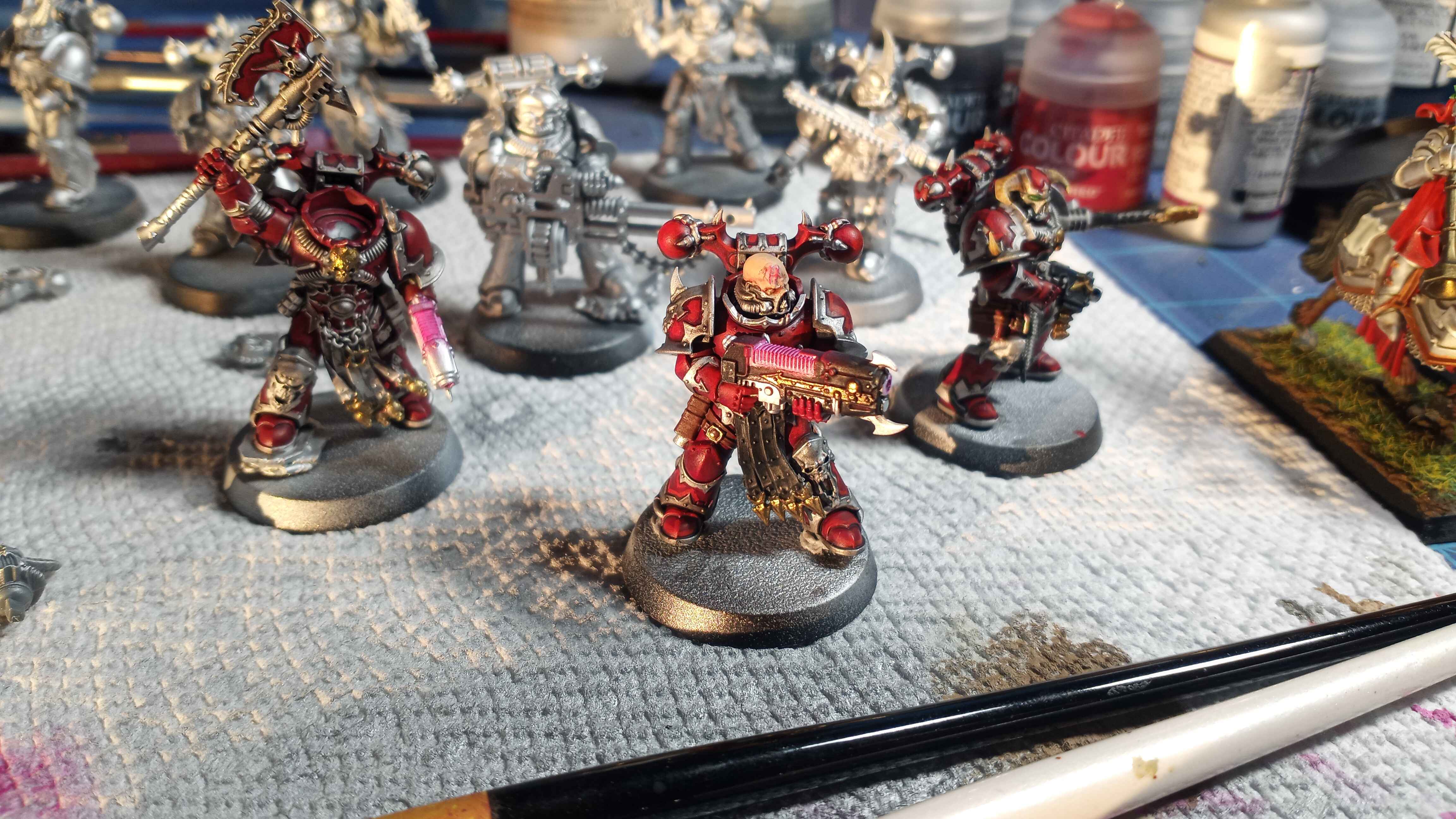 Slowly working through these chaos marines. Is it more tedious to paint the trim or base coat the model in the trim color and paint around it? I did the latter and I can feel the warp overtaking me. I'm happy with how this guy is turning out though.