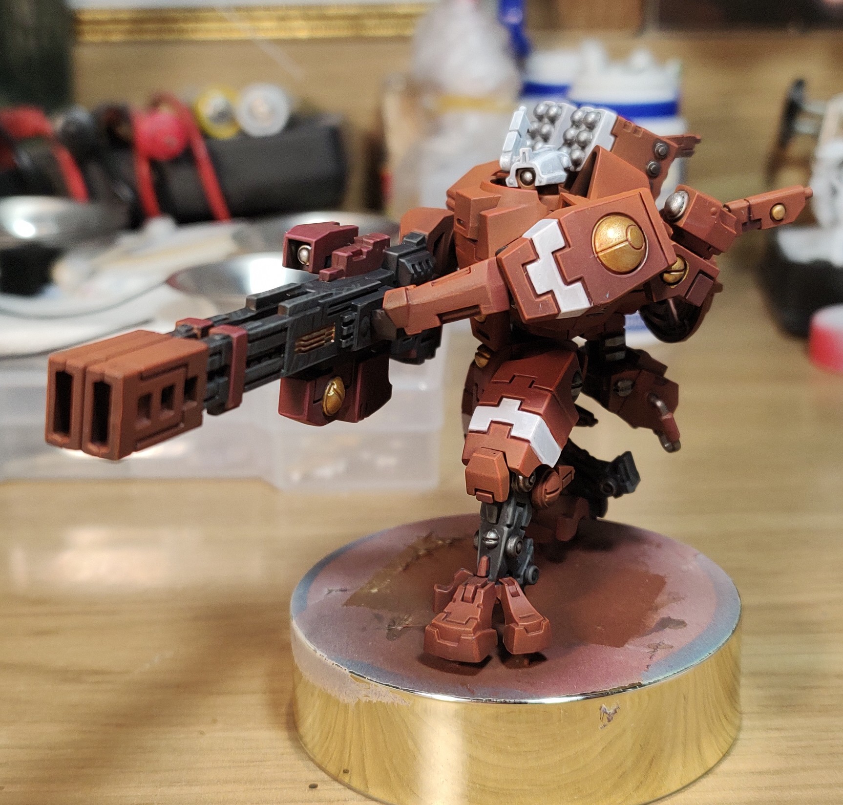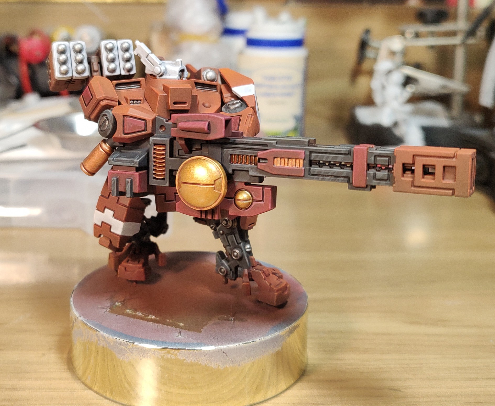 >>97768137I wanted to try kitbash Iridium armour, which is meant to be heavier. She looks less fat from other angles.It's meant to be a classical Crisis suit, normally used to interpret swathes of data and command sensibly from the rear as support, and retrofitted over the years for additional interior space, and armour to occasionally act as a ram and distractifex, for when her mostly infantry Cadre need heavier support.Also her name literally translates to "Commander Superheavy Defiance".