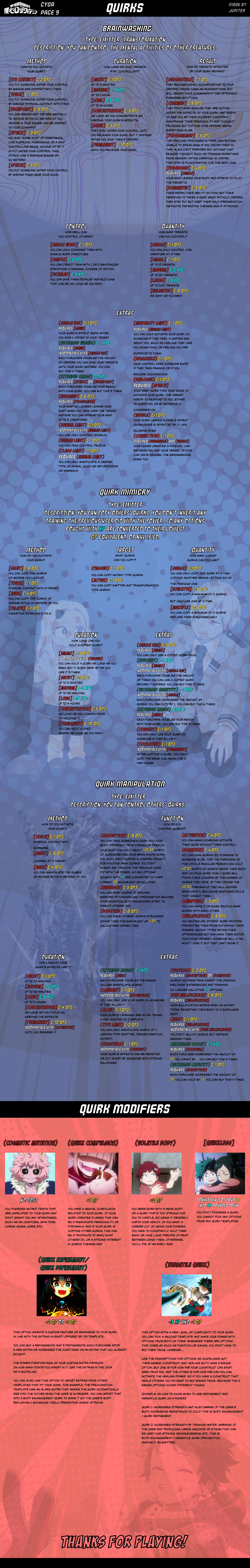 >MHA Rentryhttps://rentry.org/uhx77ys6>RULES:> Timeline: Just Another Story> Location: Japan>The Hero Students are at Shiketsu.Instructions + Template for Making Cards: https://pastebin.com/NQ6JNH8r>New Stuff:>New Writefag:>Operation DESPERADO (Seiryu, Karma, Honoken, The Villain Known As Stormrazor)https://rentry.org/62g2miaz>CHARACTER PROMPTS (feel free to answer these whenever)Former 1-D Prompts 1-50: https://rentry.org/mhampFormer 1-D Prompts 50+: https://rentry.org/mhamp2Everyone else's prompts: https://rentry.org/mhamp3Same password for all of them (mha4)>Older Prompt Links Are in Herehttps://pastebin.com/Qr3TtGa6>Fighting Style Prompthttps://archive.4plebs.org/tg/thread/88693730/#88693888>Smokin' Sexy's Class Questionnairehttps://rentry.org/xudhyrnr>Former 1-D Timelinehttps://rentry.org/MHATIMELINEhttps://rentry.org/itmttw7n>Classes Compilationshttps://rentry.org/mcymha2Dhttps://rentry.org/mcymha2Eold former 1-D comp: https://rentry.org/9bf3g>Relationship chartshttps://rentry.org/MHA_Charts>Dorms PromptDorm Room Proposal v2 https://desuarchive.org/tg/post/94701730>Tiermaker: https://tiermaker.com/create/mcymha-current-cast-16507969>Older Version of the CYOA (Both the old and new versions are legal for builds.)https://archive.4plebs.org/tg/post/94720077