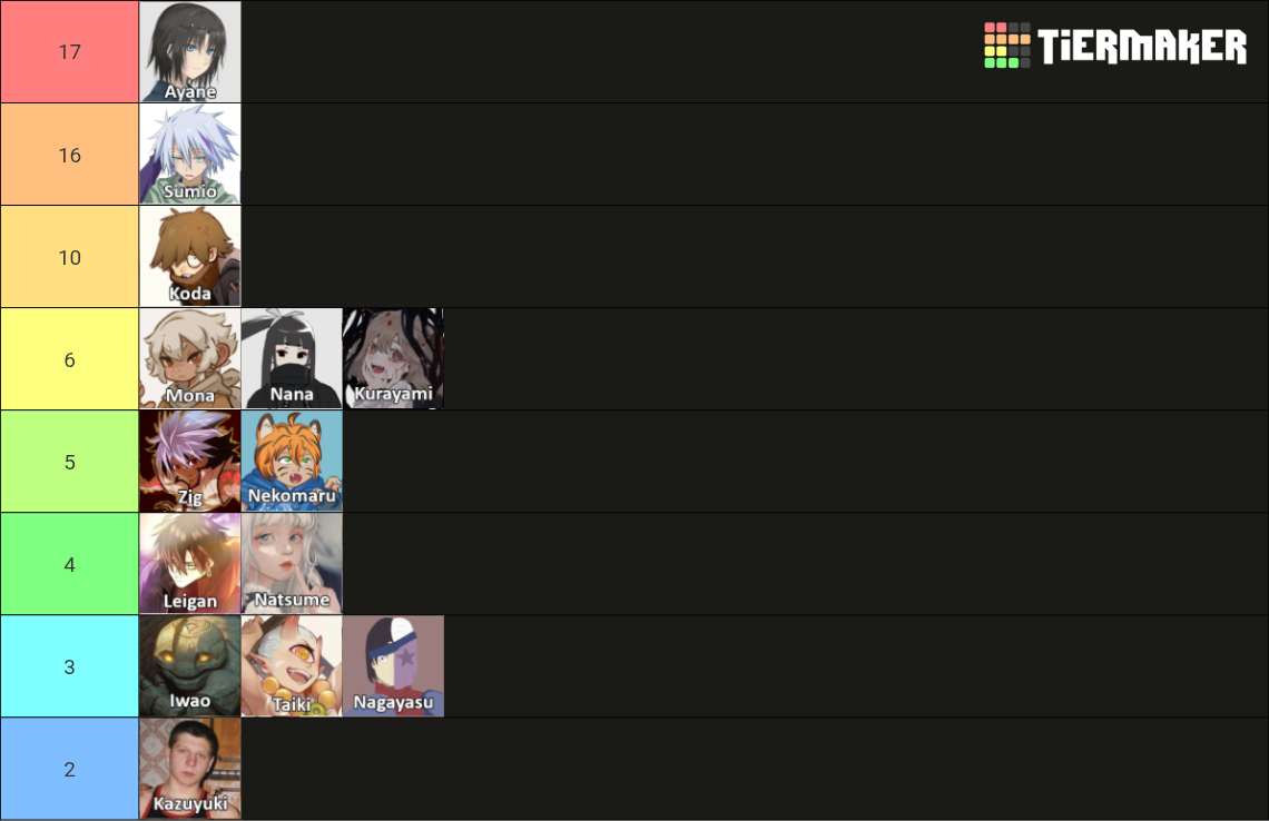 >>97772392Kosshi's priorities are as follows:AyaneSumioNagayasuKodaKazuyukiMonaTaikiNekomaruLeiganIwaoZigKurayamiNatsumeJinThe reasoning isn't anything complicated. It's a rough balance of how useful she finds them against how 'functional' she finds them.