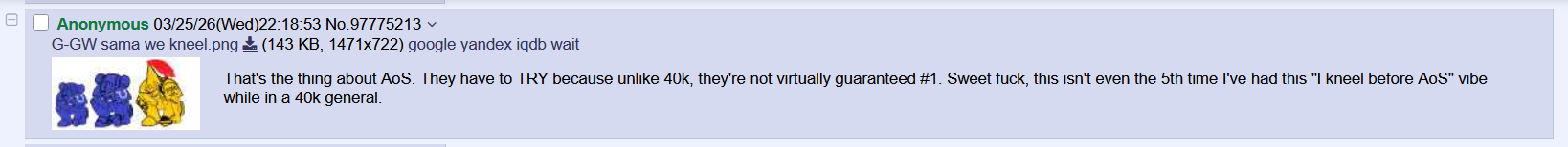 >>97774102AoS fans were always corpo slaves. GW could do anything and at most AoS bots will grumble briefly before going back to giving all their money to GW.