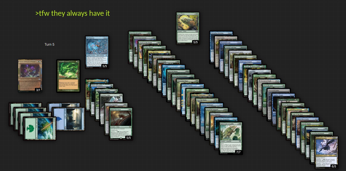 also, for all the MTGO players- any one noticing an insane increase in the meta being Michael Angelo commanders and adding like so many counters they're a 52/52? In a lower bracket game I played the dude got up to 117/117 after being removed twice. one earlier today it was like 52/52 and I just didnt have the removal in hand but theres some crazy stuff going on. and they all have trample