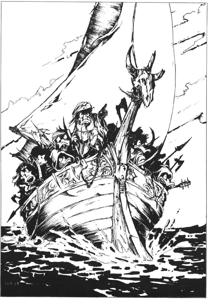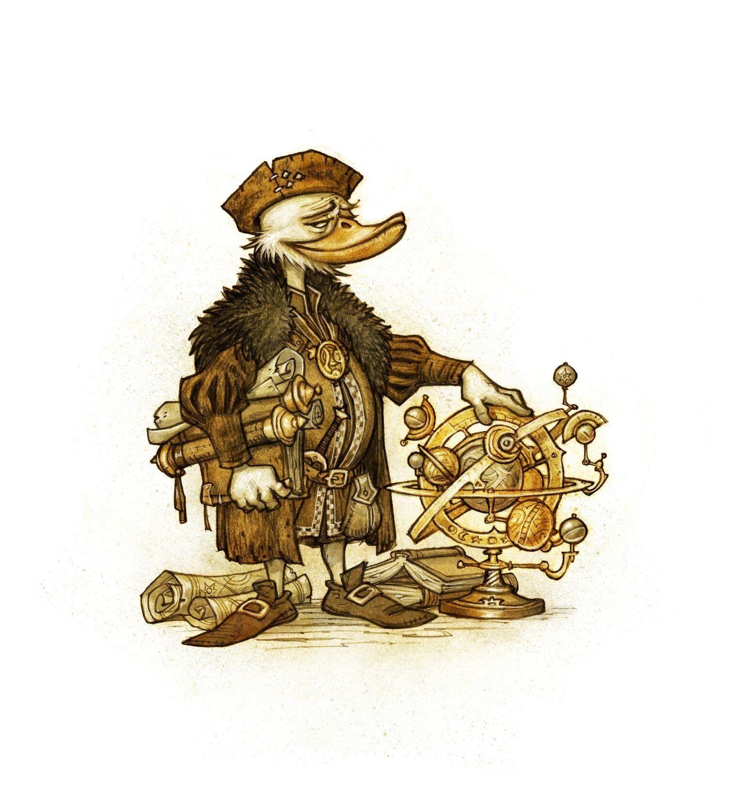 >It seems in one of the Great Conflicts that festooned Glorantha's early history a cabal of sorcerers sought to summon a thousand foot long fire breathing dragon. Somewhere along the way, a scale marker was misplaced, and instead of a thousand foot long fire breathing Drake, they got a thousand cigar-smoking male ducks. The question arises as to how these male ducks perpetuated the race. The answer is the Barbarian duck's Old Ladies. This is a fantasy world, after all.