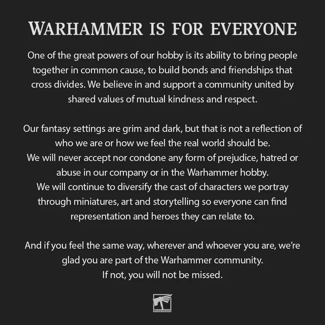 Because if you aren't newfag, you would know that GW actually had a very tolerant stance which can be summarized "we don't care as long as you buy models", jested over PETA's tantrums untill bunch of rightwing influencers (who weren'\t part of the tabletop community and only ended in 40k because they've been kicked out o everywhere else) decided to make 40k as their safe-space, practically challenging GW's control over public perception of the 40k setting (GW's property btw).