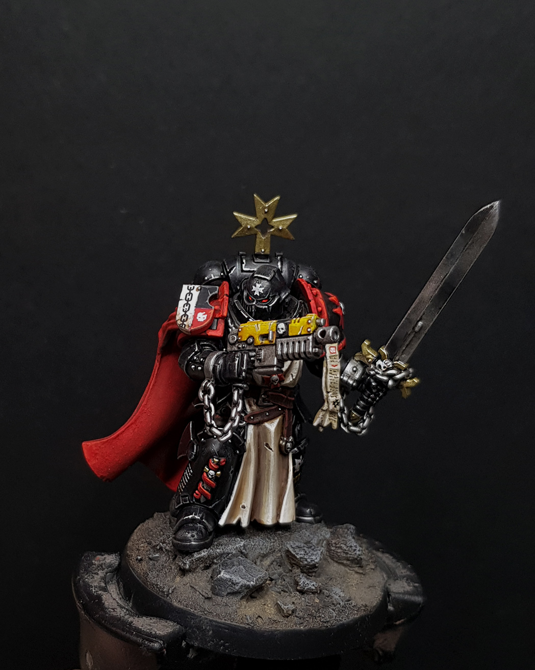 >>97816447The only time I've ever seen the process described prior to the 2000s was Tim Prow describing how he painted a Blood Angels Captain for the original Tycho Vs Ghaz BatRep>For the armour I wanted to get a really rich golden yellow colour that could almost be taken for a metallic gold. The base coat was a mix of Tanned Leather, Blood Angel Orange and Bad Moon Yellow. I washed this with Brown Ink into which I mixed a small amount of Black Ink to darken it.>The highlights were Bad Moon Yellow and Skull White added to the base coat, gradually worked up to pure Skull White at the very edges of the armour plates. I've painted these white highlights with a small star effect in places to create the impression of a glint of light catching a reflective surface.There was no write-up of the recipes or anything, but the studio Cdr Dante and Capt Tycho minis were both painted in a more defined NMM style when they released a few years later, so checking out the Codex: Angels of Death and White Dwarfs from around then for decent pics would be a good place to get some reference pics. Calgar also had some more golden-brown accents which I think were meant to be NMM, so that's another one to check out