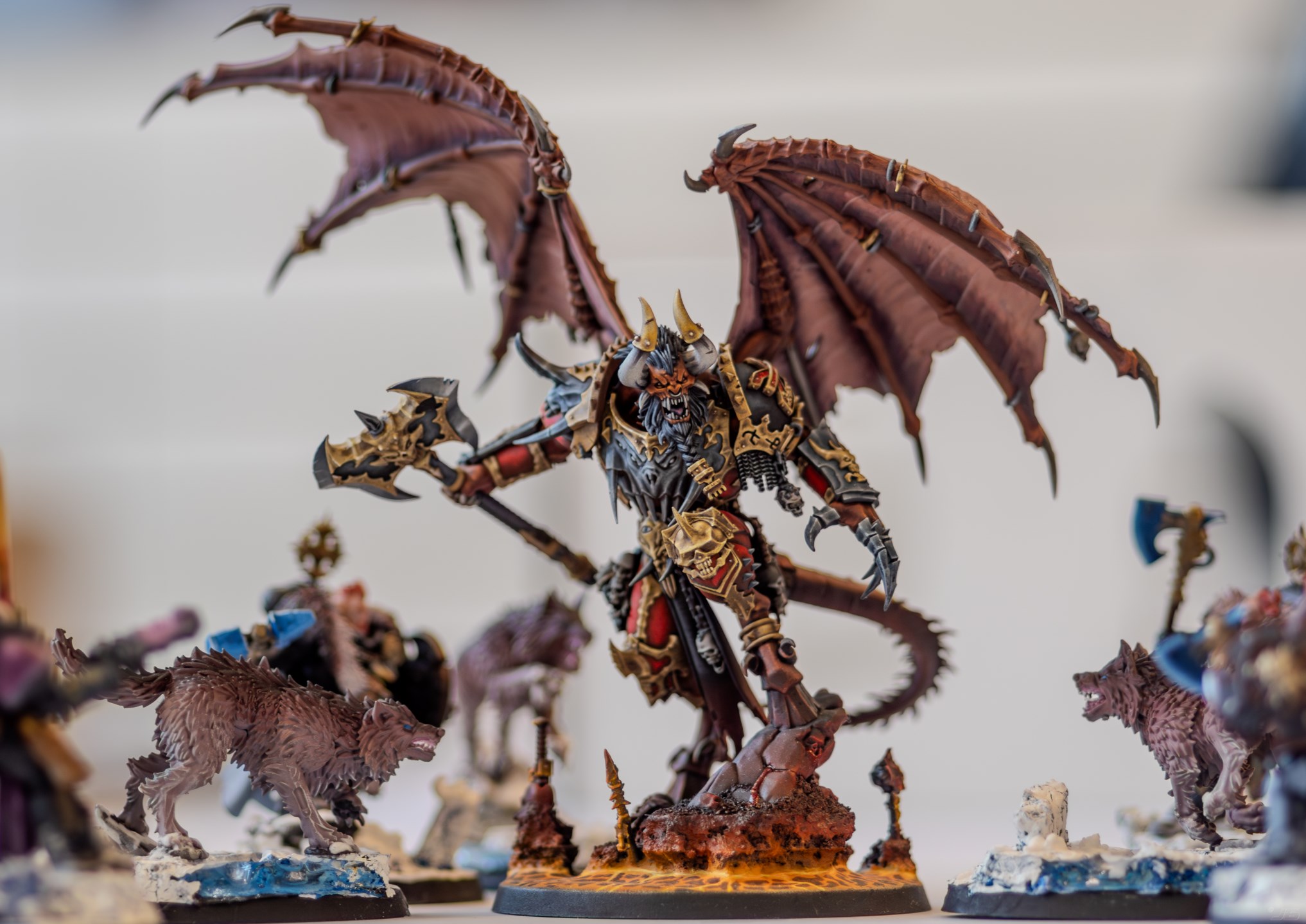 Crossposting this from /40kg/, apologies if this isn't the appropriate thread. Seeking some c/c on this photo's composition, as I am relatively new to photographing minis at 1:1 macro scale. I took it mid-match between a Wolves player and Chaos player. Any tips on shot composition or mini placement is appreciated.Also for those curious, the Daemon Prince model took 2nd place at Paintapalooza.