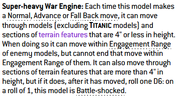 >>97801250>World eaters lords of skulls can move through terrain. Weird that csm cant. At least you're not a stompaI mean they can, but same as the old Defiler it's the fake '4" or lower' rule that's practically useless 80% of the time.