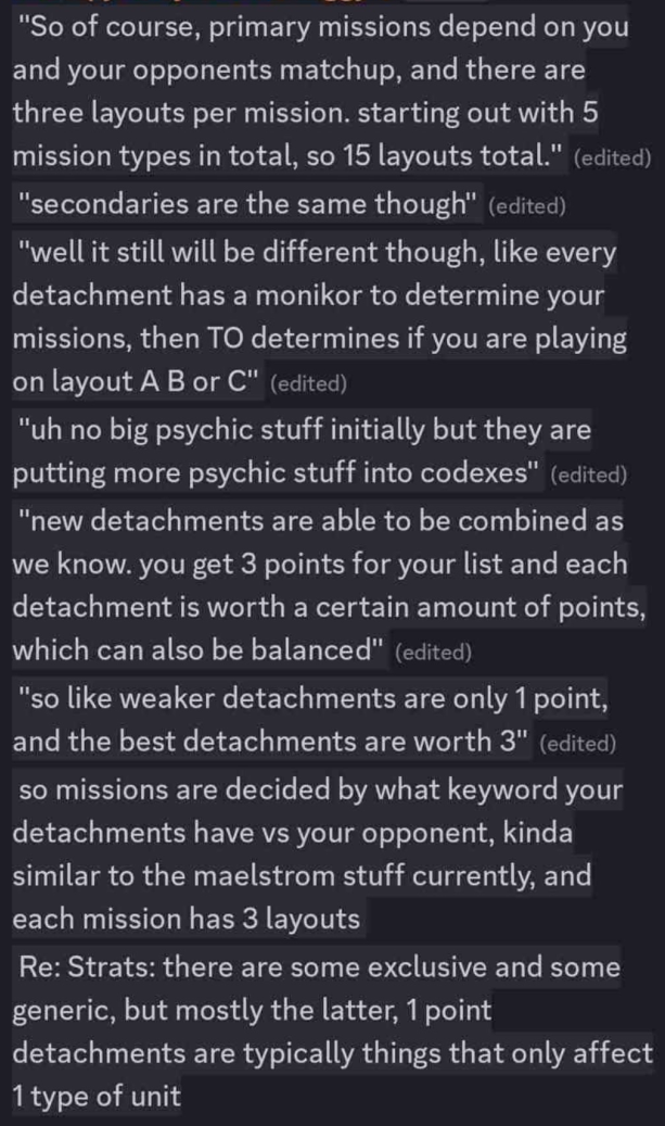 >No actual Psychic changes>Missions turned into some sort of graph instead of the simple 'Pick a card, dumbass'>Double or triple Detachment rules, the combo meta for which will probably be figured out within a week of release>Rules and codices will still cost $70>No broad shifts to durability and lethality, likely some weapons remain uselessI'm not sure I'm excited, lads.