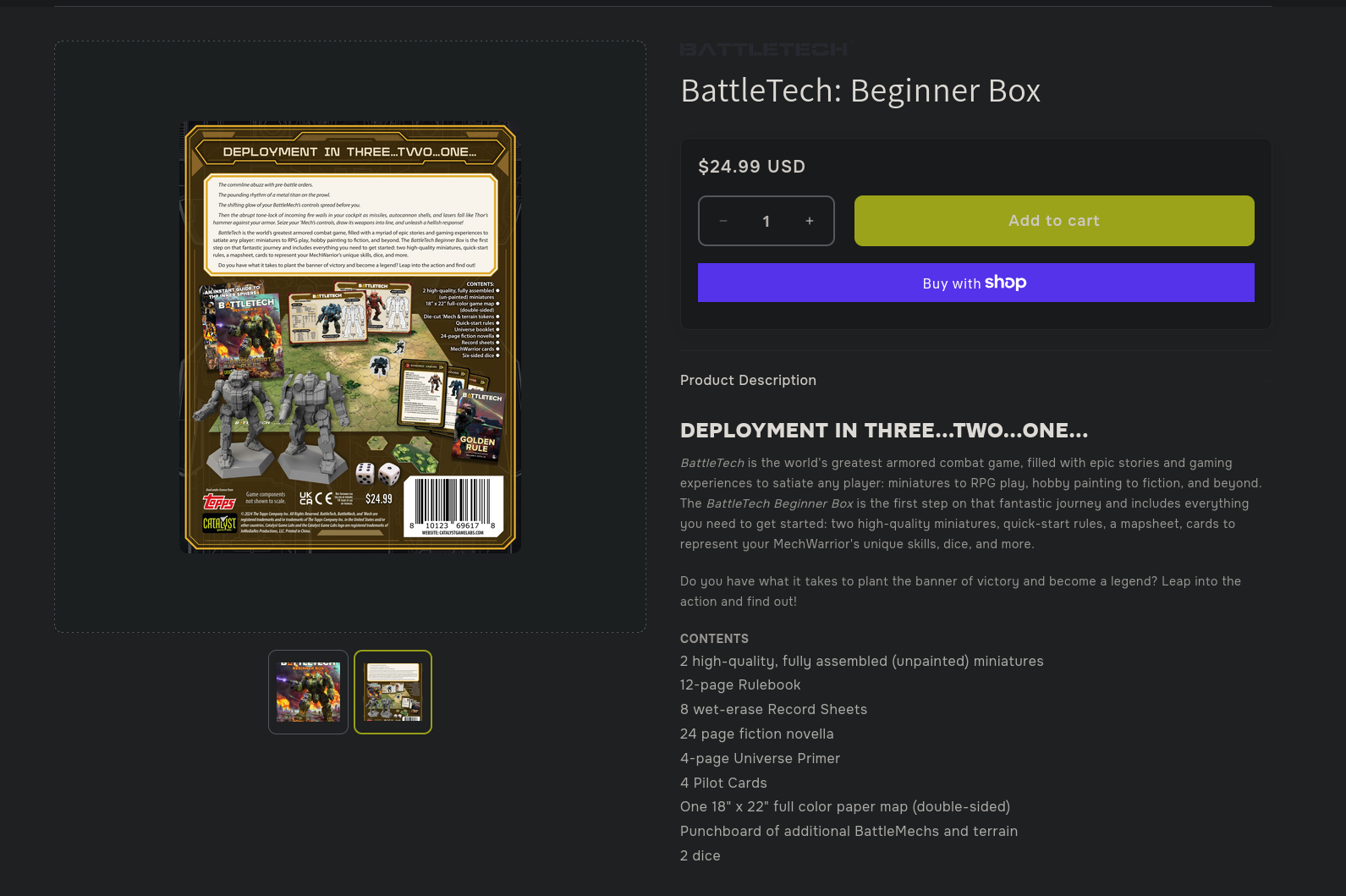 >>97810893>>97810989This.The Beginner Box only contains two mechs and abbreviated rules though, I can't really recommend it except to someone who has never played a game. The "A Game of Armored Combat" Box, which has eight mechs and pretty much complete rules (along with mapsheets, a really useful quick reference table, cardboard standees and some other stuff) goes for 60$. That's a bit more expensive, but you get a complete game and you only have to find someone willing to play with you.Protip for if you're cheap: Since the game is hex-based, you don't even need miniatures to play BattleTech, just a hexmap and some markers. Get the Rulebook from the box or the BattleMech Manual (basically the same ruleset just with more special case rules, not important when trying the game). Just look into the links in the BattleTech General on here.
