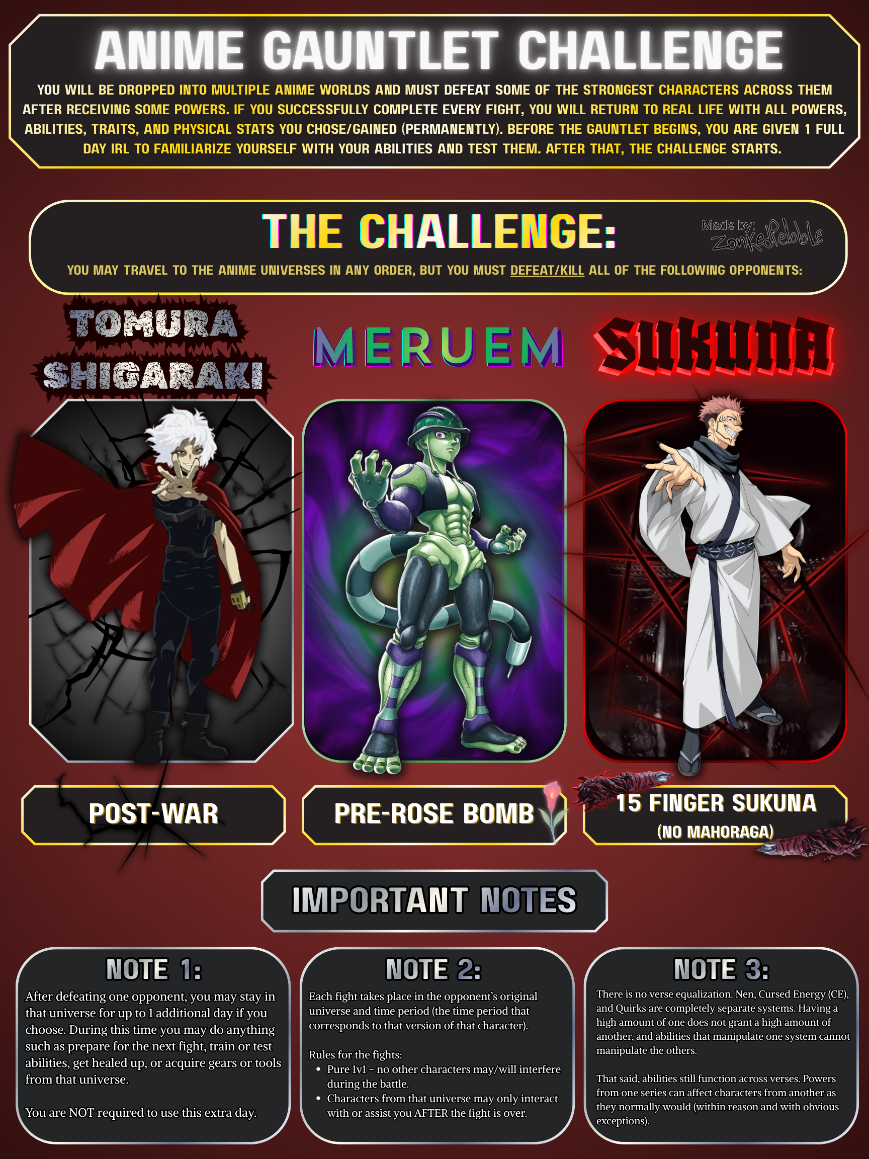 >>97814087>Order: Sukuna -> Shigaraki -> MeruemCompletely unworried about 15 finger Sukuna or Shigaraki. Meruem is a threat only for the possibility of attacking faster than I can respond to him.>Base: NeteroFastest reaction speed in all three series.>Quirk: Outburst (Ms. Joke)Most quirks are pathetic. This one causes enemies to laugh, reducing their cognition. Unavoidable and supports my cursed technique.>Cursed Technique: ComedianAbsolutely busted to have this as an option. Manifests anything I think is funny.>Nen: The Cat Who Lived a Million TimesIf I'm killed by any of my opponents a nen beast appears, eats them, and revives me. Normally countered by capturing the user without killing them but my opponents don't have that option.