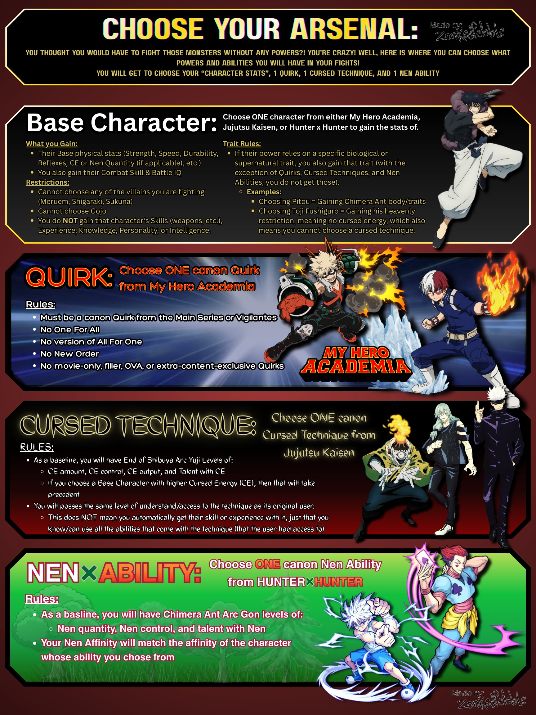 >>97814087>BaseYuta Okkotsu>QuirkHigh Spec>Cursed TechniqueConstruction>Nen AbilityParallel Future>Order:SukunaShigarakiMeruemHigh Spec means I can easily master Jujutsu and Nen and learn tons of stuff to make with Construction, Yuta base gives me tons of CE to pump into my expensive CT, and Construction is capable of both creating insta-kill perfect spheres and actual cursed tools with their own powers, like the Split Soul Katana and Kamutoke. So the idea is to kill them all with Perfect Sphere, or just nuke them.