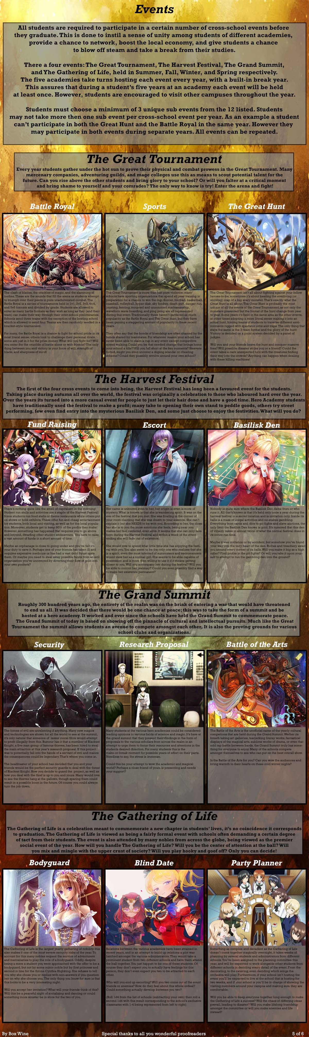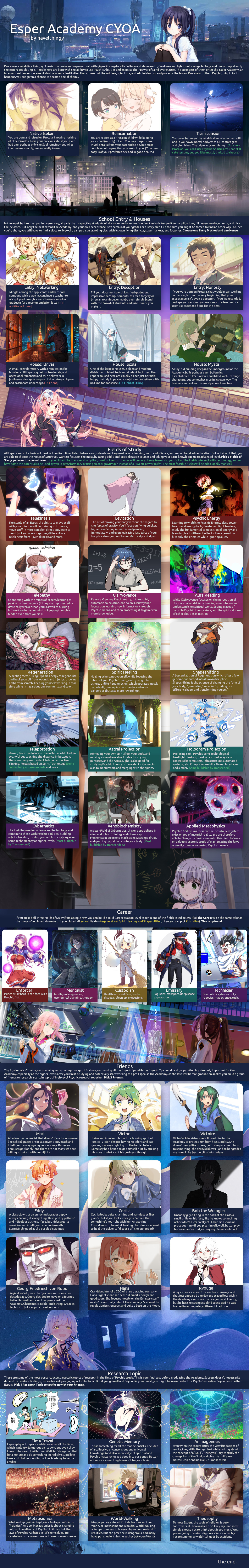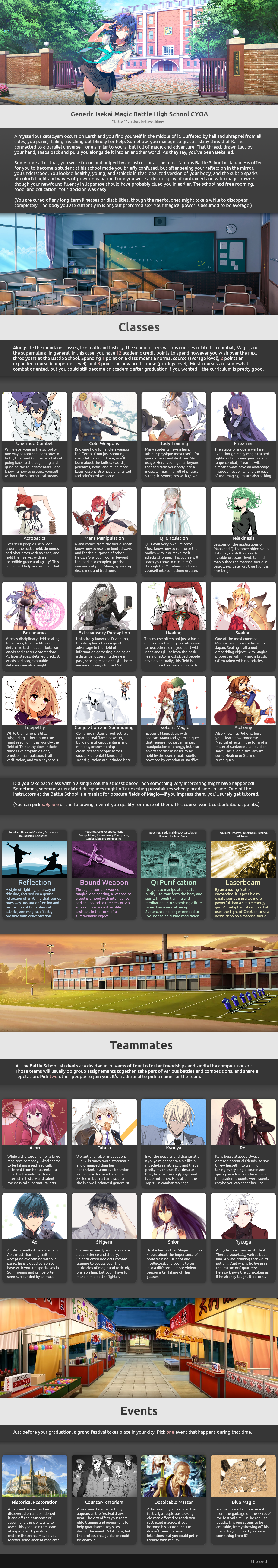 >>97814120>SchoolJah'Kara Tel>ClassesArcane Magic 3Knowledge (Magic Theory) 3Spiceology 3Arithmetician 3Avatar State 2>CompanionsLyndyAmun AdamakEldaah> EventsEscortBasilisk DenResearch ProposalBodyguard> ClubsCultural Club (Board Games)Paranormal Research>DrawbacksHated Prodigy x2Wawawa