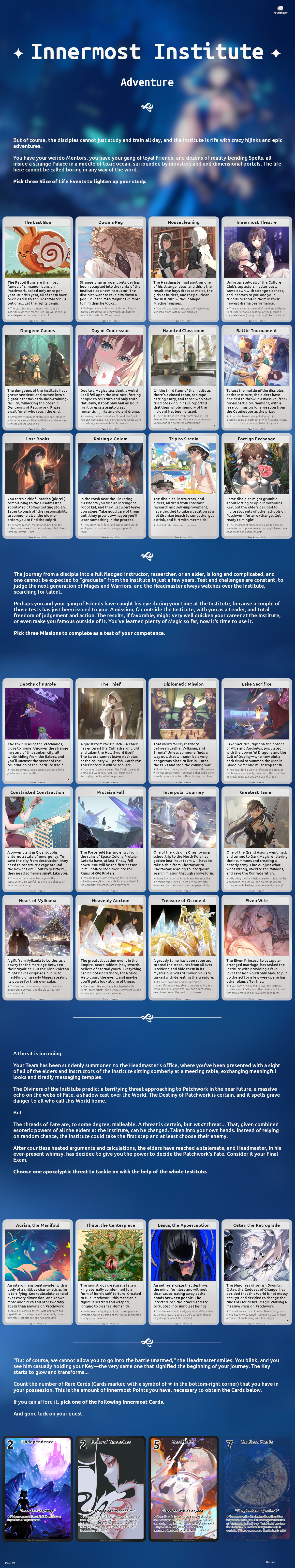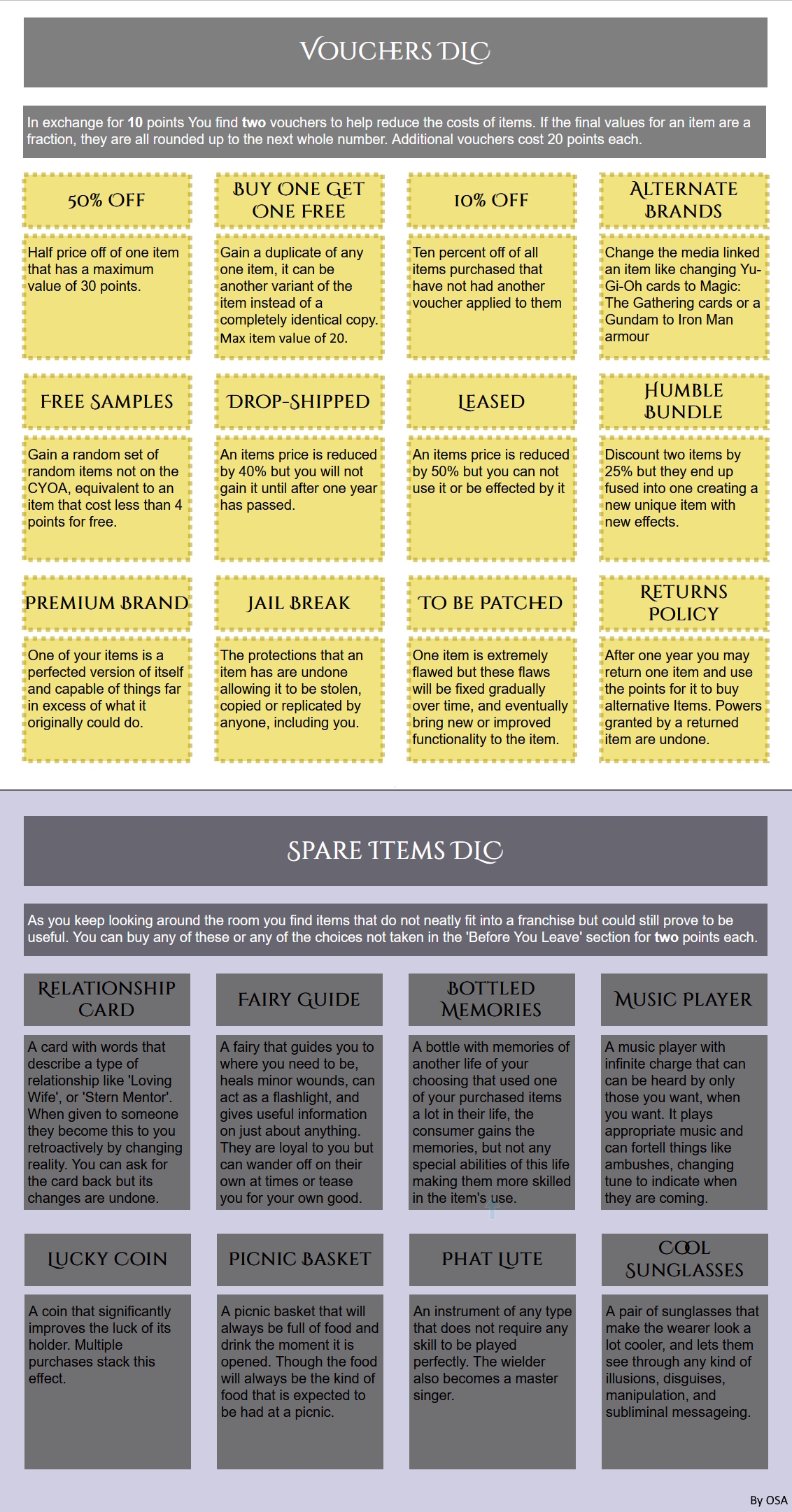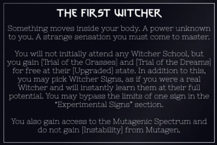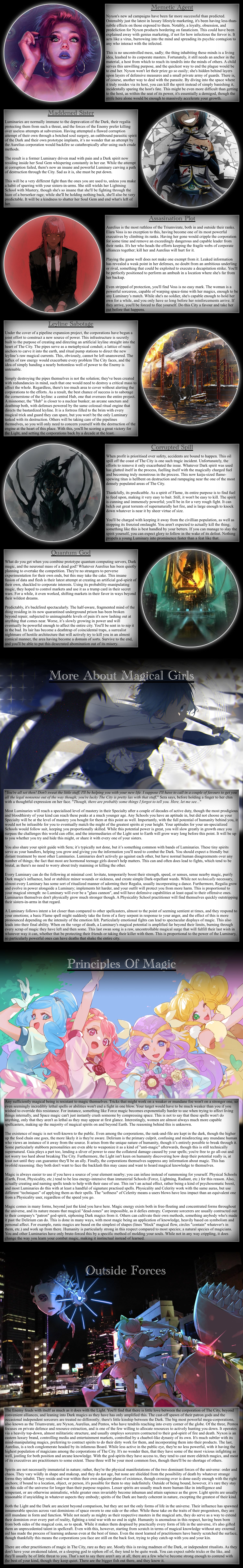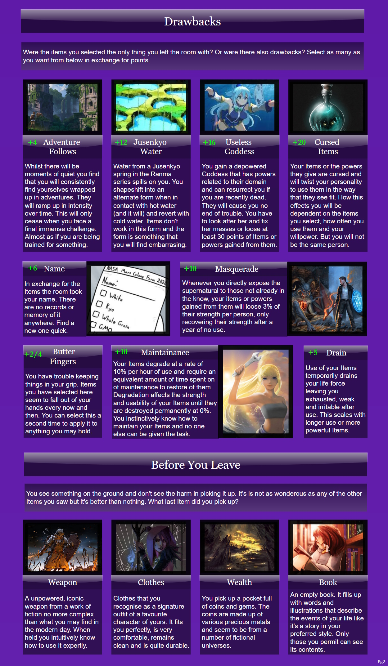 >>97814088>>97814097This should be complete, so I will try to post it, I will post explanations and plans later, probably will order it a bit too, if there is some mistake it's because I almost didn't sleep.>OriginMother's Little Reincarnator>FatePast: JudgementPresent: The SunFuture: Temperance>Body: MaleDeviousLuckyInnocent>StatusWild BeyonderNoble Descendant>RegionForsaken Land of the Gods>Secret OrganizationsChurch of Evernight GoddessChurch of God of Steam and MachineryDemoness SectRose School of ThoughtTwilight Hermit Order>Noble FamilyAncient God Descendant>PathwayPrisoner (Ancient Bane)>Past History Excess imbuement (S9 Chained)S9: Mystical Dilettante, Accidental advancementS8: United in Blood, Bounty Hunter, Mundane Acting, Rampager Encounter, Gathering AttendeeS7: Gathering Convener, Hero Bandit, Slow and Steady, Anomaly victimS6. Clandestine Nemesis, Gray Wedding,Tomb RaiderS5: Common Adversity, Legend in The Back, Calamity SurvivorS4: Forbidden Lore, Deity Mark, Ancient Treasure, Public MenaceS3: Old HorrorS2: Myth of The Second Epoch>PurificationsRepose (-2 Darkness)Indulgence (-2 Abyss)Cure (-2 Moon)>WealthGolden Binder (Free)Pot of Charity (-12)Yellow Press (-1)Full Cloth Alchemist (-11)Cursed Leather (Free)Staff of Spring (-2)Hidden Realm (-7)>KnowledgeActing MethodAncient Languages x2Mystical RitualsEpoch knowledge x2>InfluenceDarcie Zoroast (S5 Error) (Free Gray Wedding)Julius Sudworth (Macey Bell (S5 Tyrant)) (Eloise Augustus (S5 Black Emperor)) (Jessamine S. Ruof (S5 Chained)) (-3) (Bounty)Cyrielle Bellamy (S9 Sun)Sinni Ava (S3 Demoness) (-18)Chloe Massey (S8 Mother)Most Secret Organization (-5)Tacit Agreement (-8)>CoincidencesTrue God's Seal (Free)Infiltration x4 (-8)UniquenessSefirot (-9)