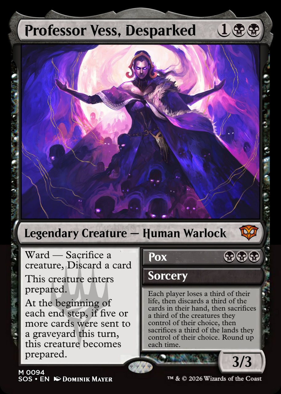 >>97816466She was a walker in duskmourn. She wouldn't be desparked. This is a fake.Also come on people, a 3cmc creature with effectively hexproof, who enters prepared, casts pox, and enables the pox again?>sent