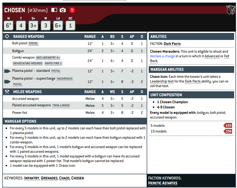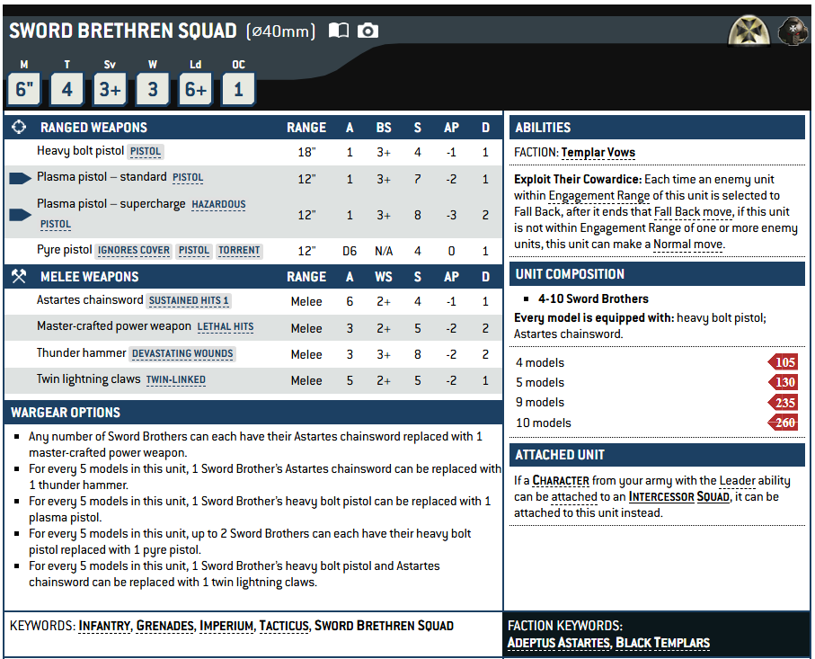 >>97822233>>97822241Speaking of merging stuff, the way I'd reorganize the army would be:>HQs>Major Officer (Captain, can be upgraded to chapter master, limit of 1 per army)>Minor Officer (Lieutenant, can be "upgraded" to become a chaplain, librarian, techmarine, potential for other esoteric characters like 30k master of signals or praevians or stuff like that)>Retinue (essentially bladeguard and all their chapter specific variations of 3/6 melee dudes with 40mm bases, they need a major officer to lead them)>Troops>Tactical squad (essentially current intercessors + assault intercessors but with boltguns, troop size 10-20)>Tactical veteran squad (essentially classic tactical squads, less numbers but get access to special weapons)>Assault squad (just the current assault intecessors with jump packs but with a non-retarded name and let them take eviscerators again for the love of god)>Terminator squad (merge both squads, just keep the loadouts as they are but fix the distinction between hammers and power fists right now they are completely unbalanced)>Vanguard vet (stays the same)>Sternguard vet (their classic role has been aped by the primaris weapon squads, they need an actual niche using special rules, they currently are just so boring. This is where bolt rifles go)>Special weapon squad (merges hellblasters, infernus and adds a melta/grav squad, but they should use the actual special weapons, no need for a +1 long primaris version when no other unit can take one for every dude anwyays)>Heavy weapon squad (same as above but with the heavy weapons, let the sergeant take one too for fucks sake, hastarii can take them even though the model just gets a sword and pistol for some reason)>Merge all the gravis squads too.