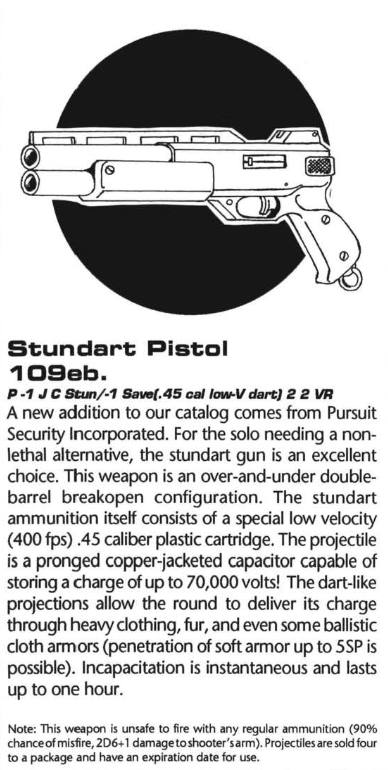 >>97877753>projectiles have an expiration date>we're not going to tell you how long it isThanks man, adding "one-month" would have been just too many extra characters.You're probably supposed to use the standard reload price, but only get four instead of 100. Then again, they didn't bother saying what class of pistol this is to be treated as.