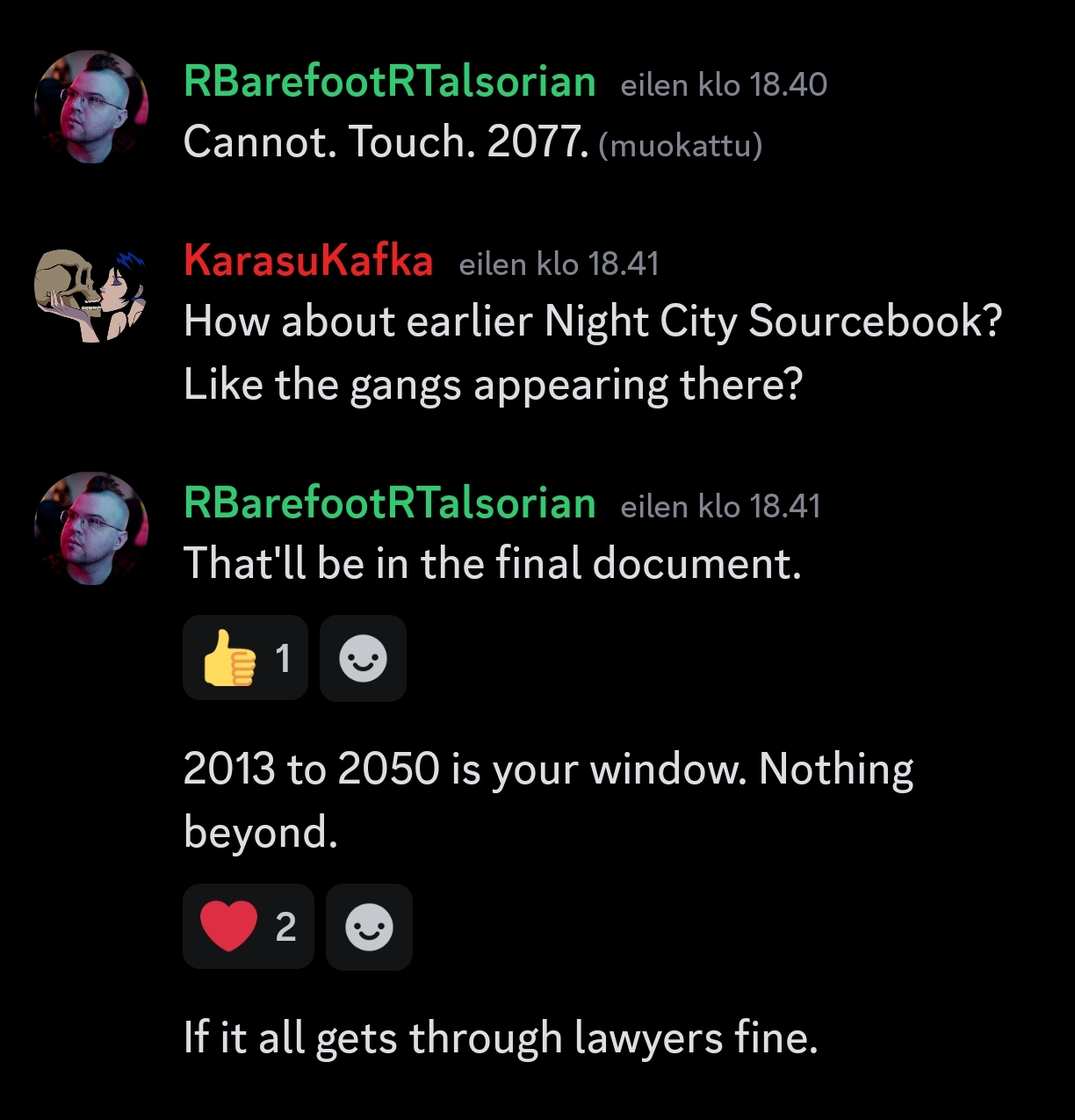 And this is definitely just boomer nitpicking, but I don't love that edgerunners inc is now the name of an ad hoc community police org in the old combat zone. just doesn't work for me as a name - its too good as a name for essentially a street merc guild. also, current count of poly throuples in NC45 is 2.