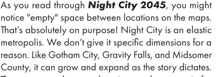 >>97907362But if you want undefined locations just set your game in a neighboring city like San Fran.>>97907364Personally I love the every block defined style + phone numbers and all that. 2020 NC and Al Amarja from Over the Edge are pinnacle of tabletop city design.