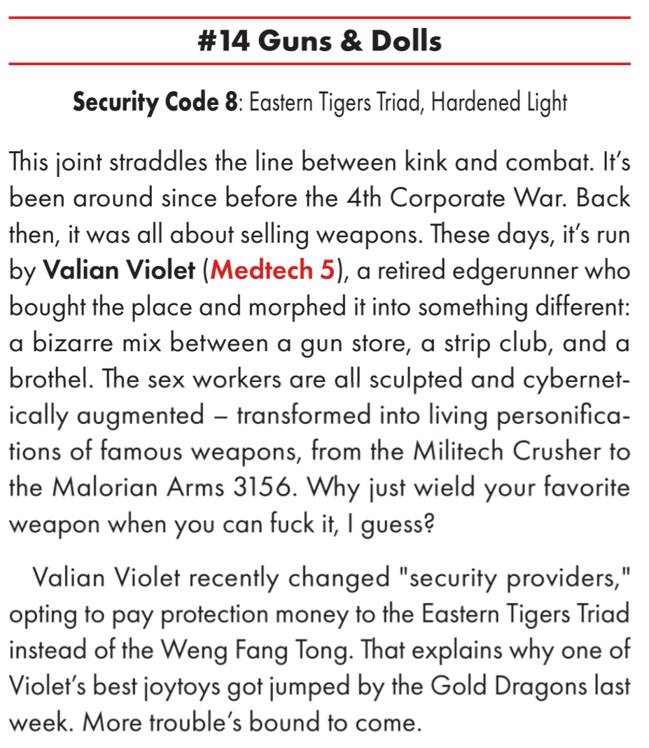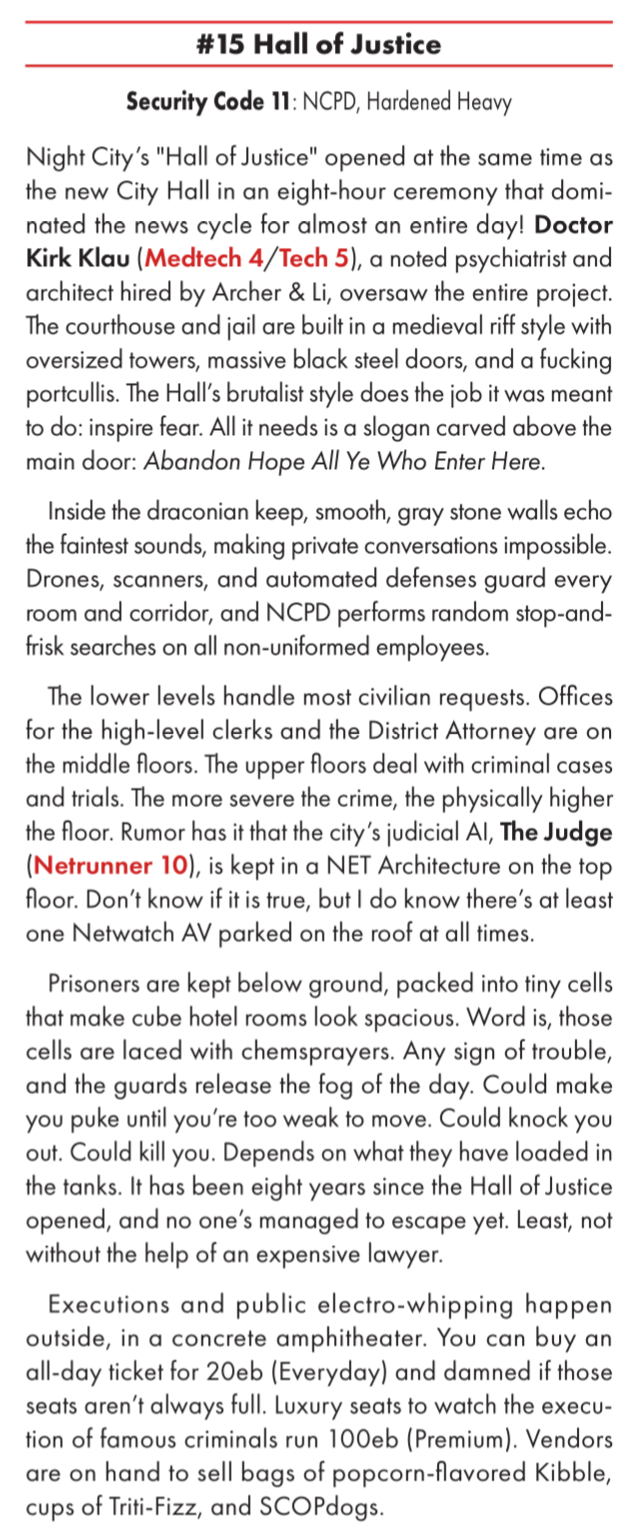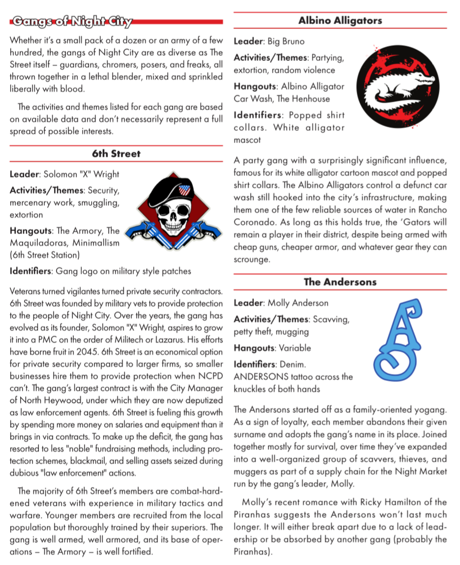 >>97907169my least favourite is the princesses of justice. a poser gang/guardian gang of girls doing a she-ra thing with flaming swords etc to protect victims of domestic violence. it's just a bit much to mix cringe with battered women for me. but the fact that they're based on the uni campus, well, that does seem exactly the sort of stupid uni students would get up to. but I still find it a bit embarrassing and tonally weird.the more traditional organised crime groups also feel better here than in the original. they feel more present and natural - I never quite felt the mob gelled in the original. They also list security forces and the corporations on the city council, to an adequate level of detail.there's also a few subtle but notable retcons. the sense of being 'post apocalyptic' from the core book is squarely gone and the corporate "faces" law is explicitly not applicable to NCobviously I'm not into the meat of the book yet, the district by district breakdown, but so far this book is exactly what I've wanted from red since launch, and great for GMs. also, it's explicitly an in universe guide, with it said that players can know anything here by purchasing it for iirc 500 ebs and running library search. in practice this means this book is perfectly fine to give to players, and I think could be quite helpful in them for character creation.also, the book is endearing me to the lawman now, since so many npcs with the lawman role are not beat cops. it could be interesting to run a 6th street lawman, for example. Some of the cops are literally just mob enforcers deputised too. I do wish we got art of some notable locations and people like the OG though. it's hard to deny that book had more soul - the art of the combat zone or city hall is still really evocative to me. and as usual I find all the red just a bit tiresome on the eyes