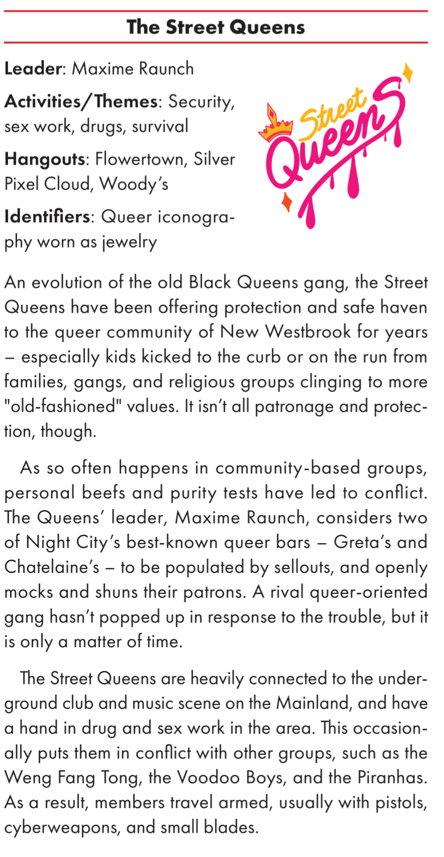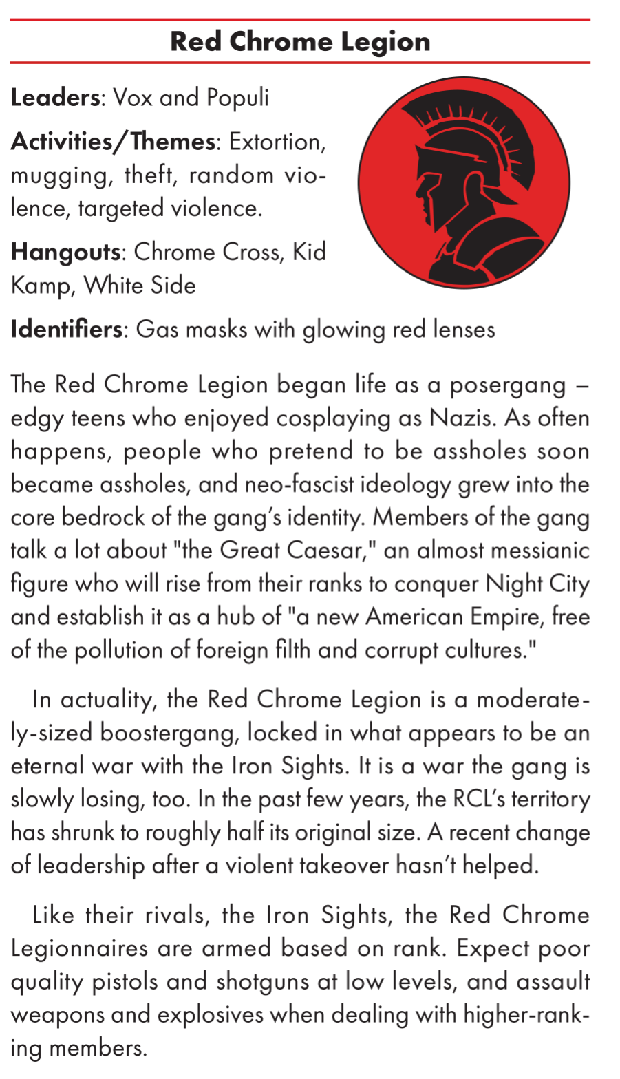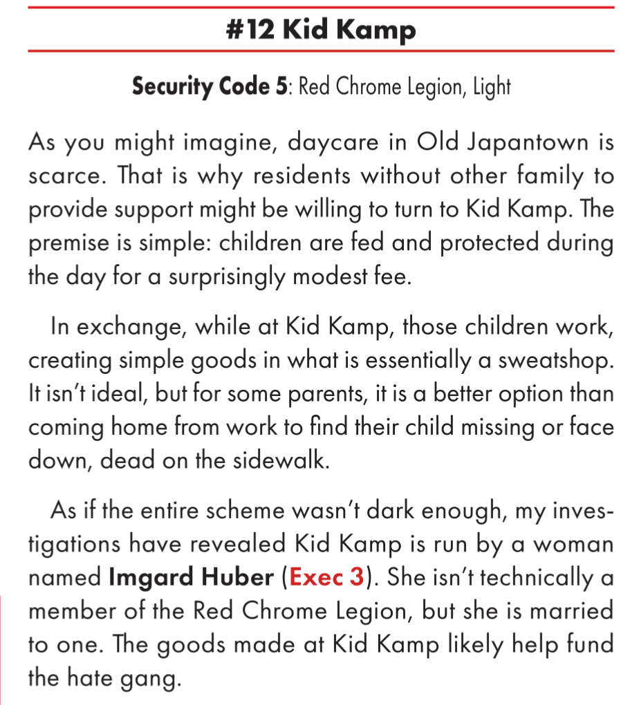 >>97907169my least favourite is the princesses of justice. a poser gang/guardian gang of girls doing a she-ra thing with flaming swords etc to protect victims of domestic violence. it's just a bit much to mix cringe with battered women for me. but the fact that they're based on the uni campus, well, that does seem exactly the sort of stupid uni students would get up to. but I still find it a bit embarrassing and tonally weird.the more traditional organised crime groups also feel better here than in the original. they feel more present and natural - I never quite felt the mob gelled in the original. They also list security forces and the corporations on the city council, to an adequate level of detail.there's also a few subtle but notable retcons. the sense of being 'post apocalyptic' from the core book is squarely gone and the corporate "faces" law is explicitly not applicable to NCobviously I'm not into the meat of the book yet, the district by district breakdown, but so far this book is exactly what I've wanted from red since launch, and great for GMs. also, it's explicitly an in universe guide, with it said that players can know anything here by purchasing it for iirc 500 ebs and running library search. in practice this means this book is perfectly fine to give to players, and I think could be quite helpful in them for character creation.also, the book is endearing me to the lawman now, since so many npcs with the lawman role are not beat cops. it could be interesting to run a 6th street lawman, for example. Some of the cops are literally just mob enforcers deputised too. I do wish we got art of some notable locations and people like the OG though. it's hard to deny that book had more soul - the art of the combat zone or city hall is still really evocative to me. and as usual I find all the red just a bit tiresome on the eyes