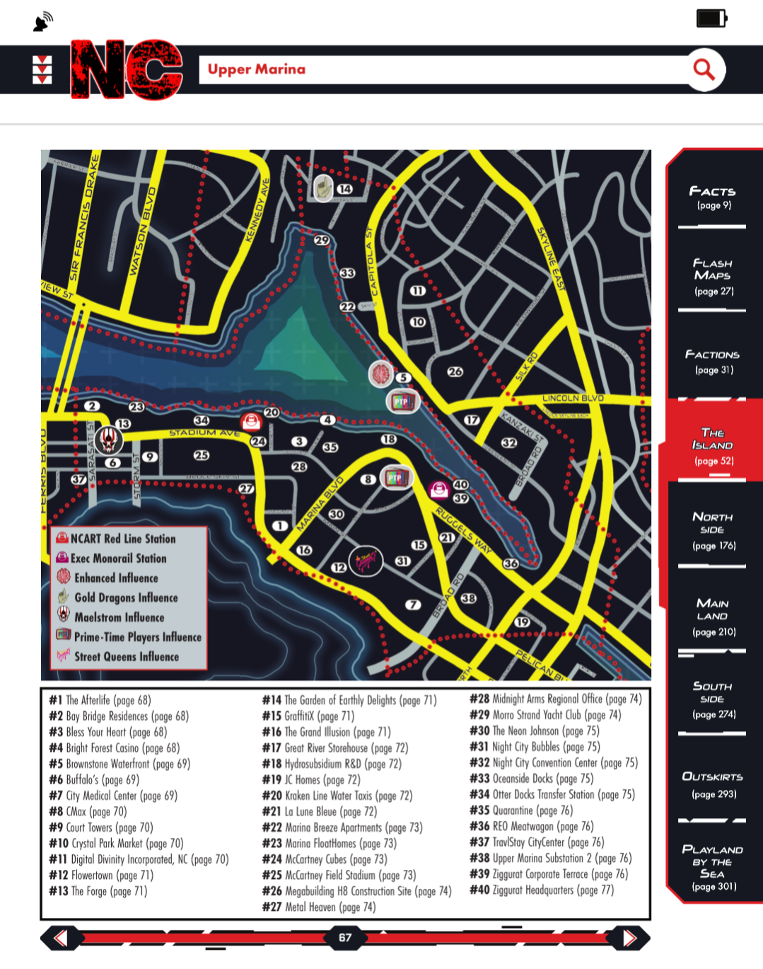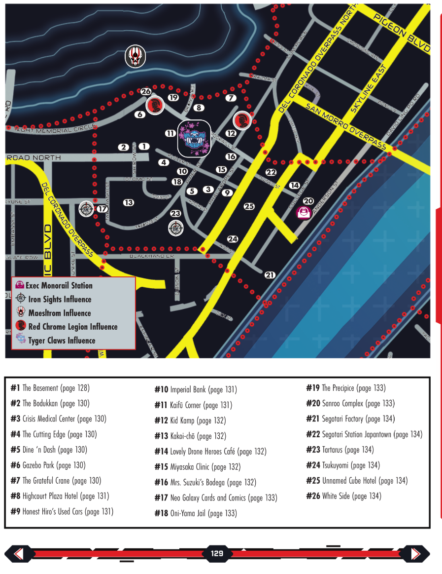 also the hyperlink autism on display is well beyond my power levels. >>97907097 every one of those bubbles on the map links to the relevant page, as does every item in the key below, and it has tabs on the side to navigate to the other sections. every one of those gang symbols also acts as a hyperlink to their page in the factions section. the tab at the top of the page brings you to the start page for that district section. It's almost too much, it's hard to swipe on some pages without clicking a link. I'm honestly awestruck. it's not even obvious these links exist, I just find them accidentally when I fat thumb my phone screen. How many labour hours did this take?
