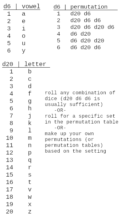 i came up with a random word suggestion oracle that seems to work fine for my head >roll for letters >come up with a word that starts/ends/contains the rolled letters >you can treat the letters as either combinations or permutations i find that 1 consonant and 2 vowels (d20+d6+d6) are usually enough for me to come up with a setting-appropriate name or word. it also results in some funny names like "Lord Kirklandius" or "Longdong Station" depending on where my headspace is at or which object happens to be on my desk.