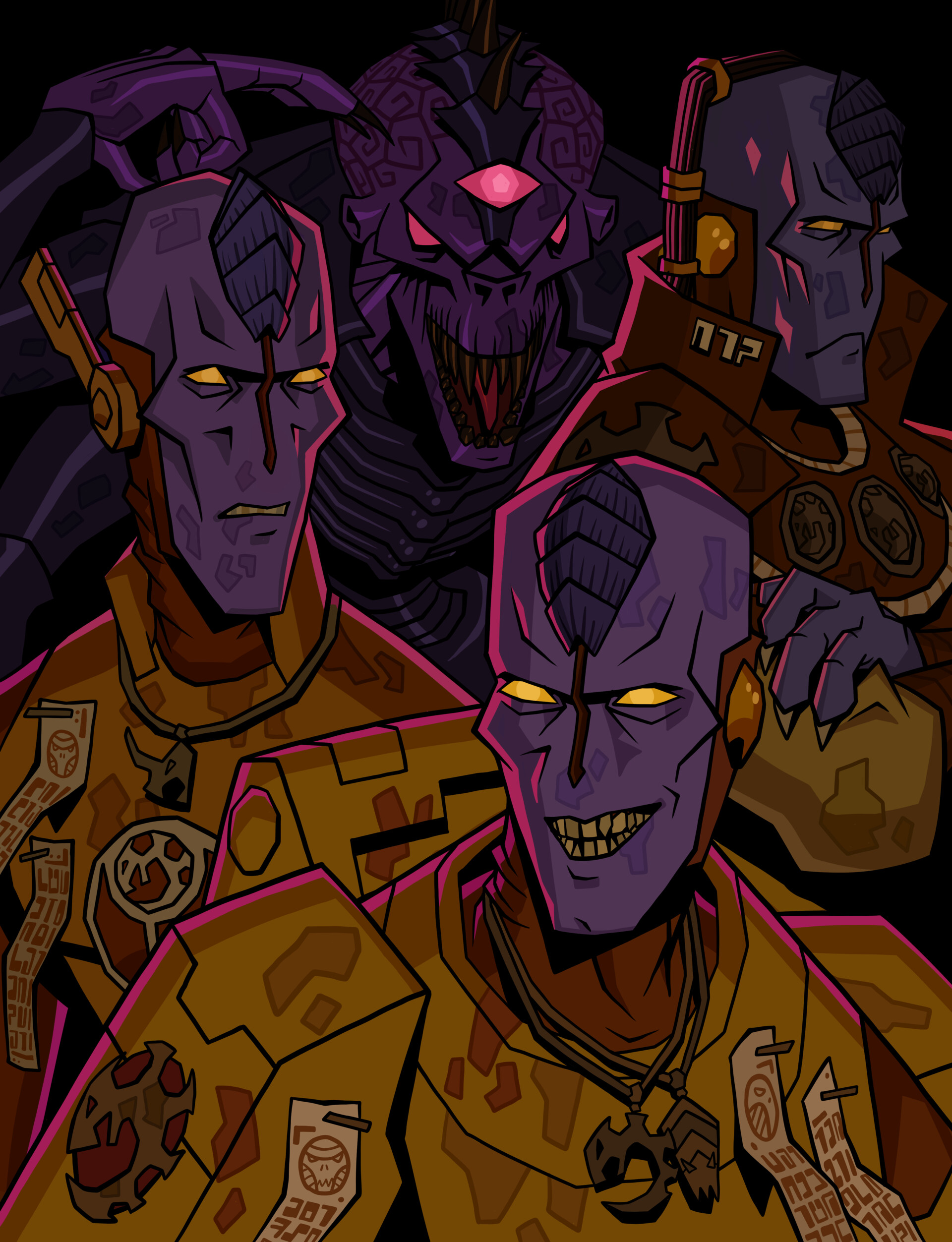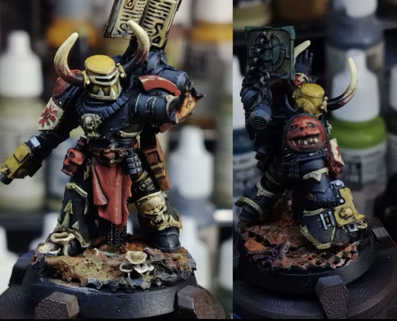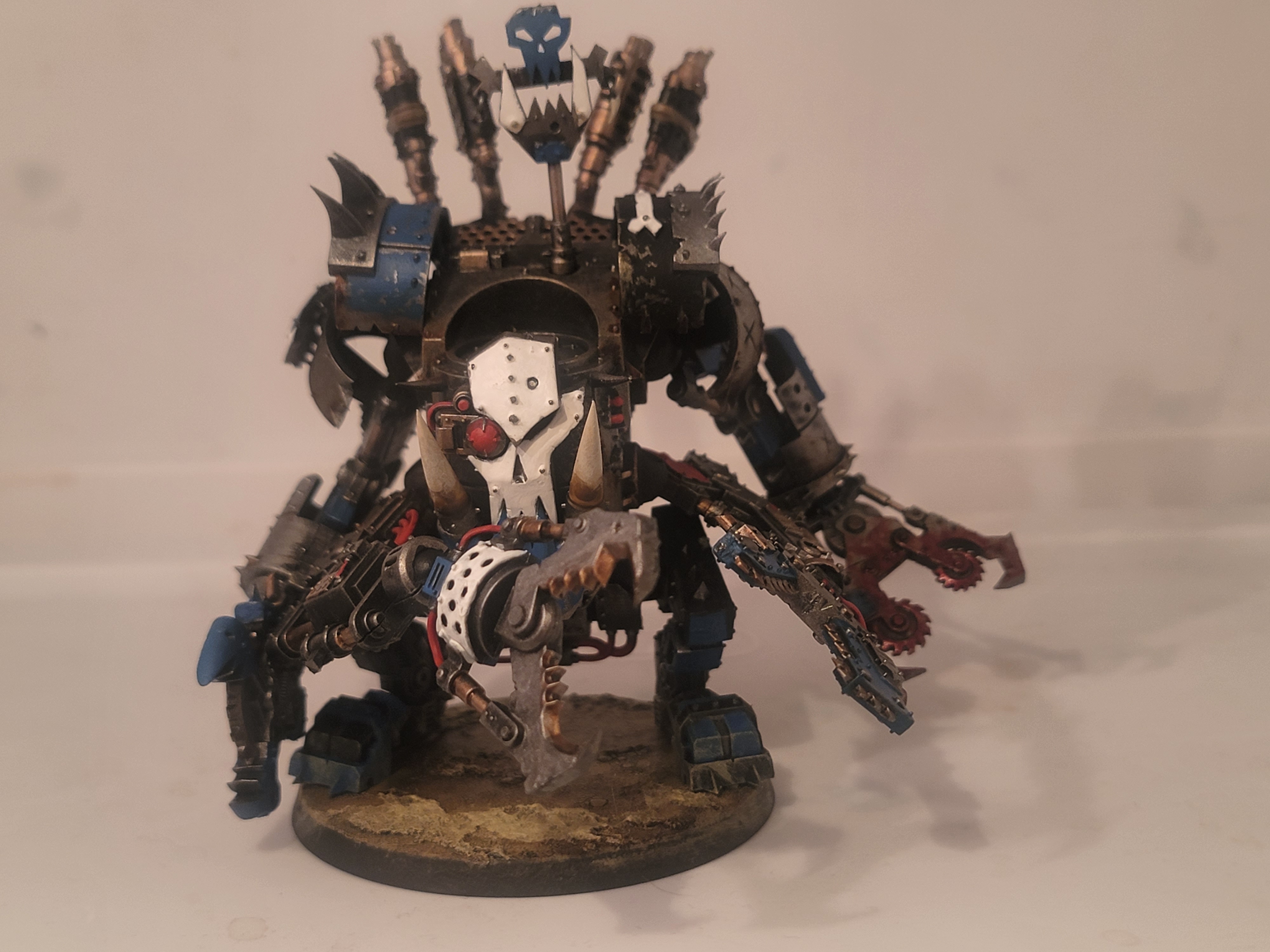 Any fun ideas for heraldry on a chaos knight? I wanr to free hand some fun stuff on every panel, and by my count that's a grand total of 15 heraldry zones. Some ideas I have:>red and white checkers, but all the red checkers are compressed little funny demon faces>as above, but the white are skulls>blanchian demon portraits>half chaos stars>hazard stripes>a stylized portrait of the current pilot >an imperial character - probably a space wolf - being shredded by demonsAny other ideas that might be fun?>>97843171worst case you can paint any normal marine helmet you have handy light grey, maybe freehand a little rune on it