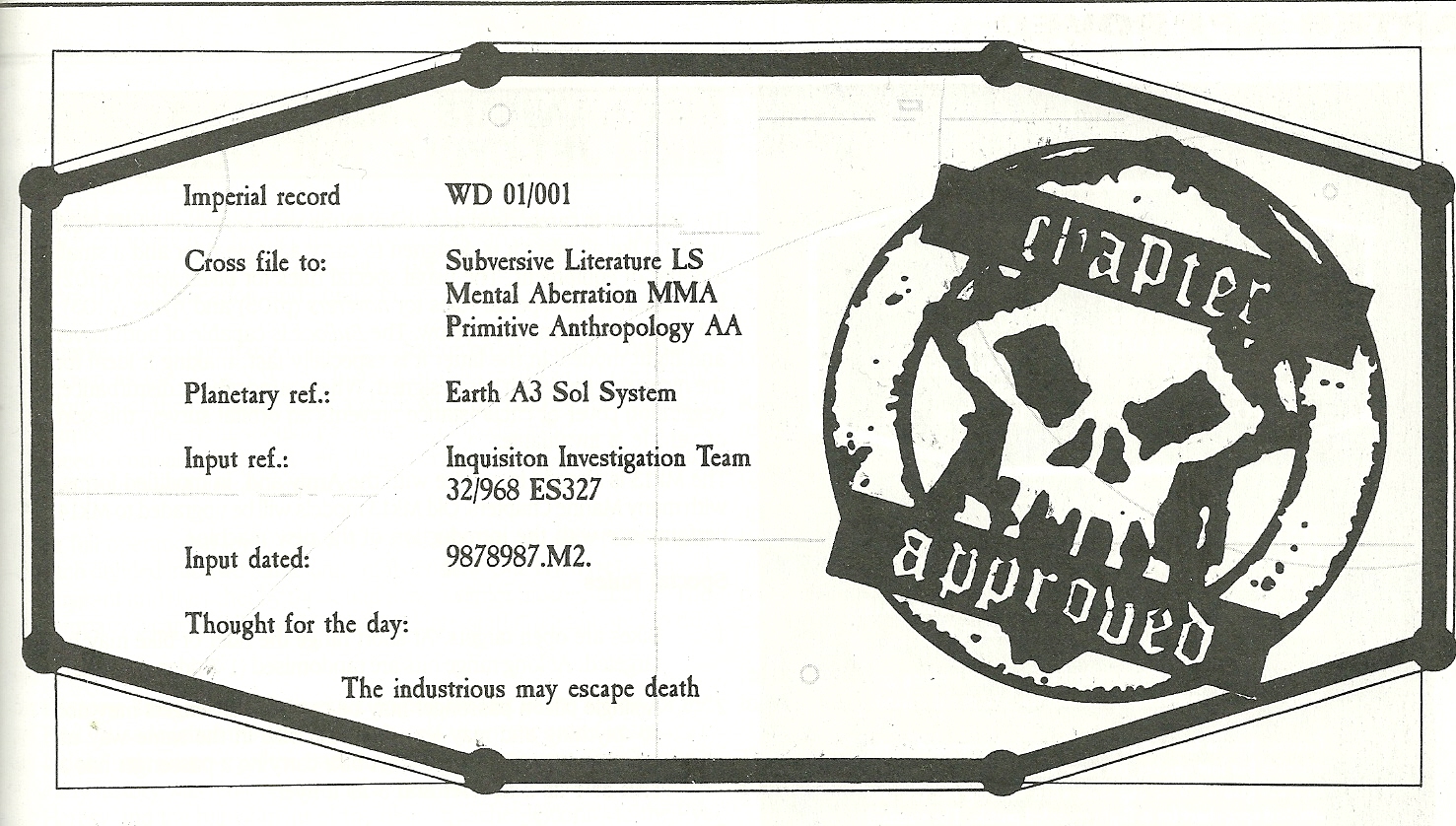 >Each displaying disturbing images of, presumably, ancient xenos and warp entities and marked with untranslated archaic inscriptions
