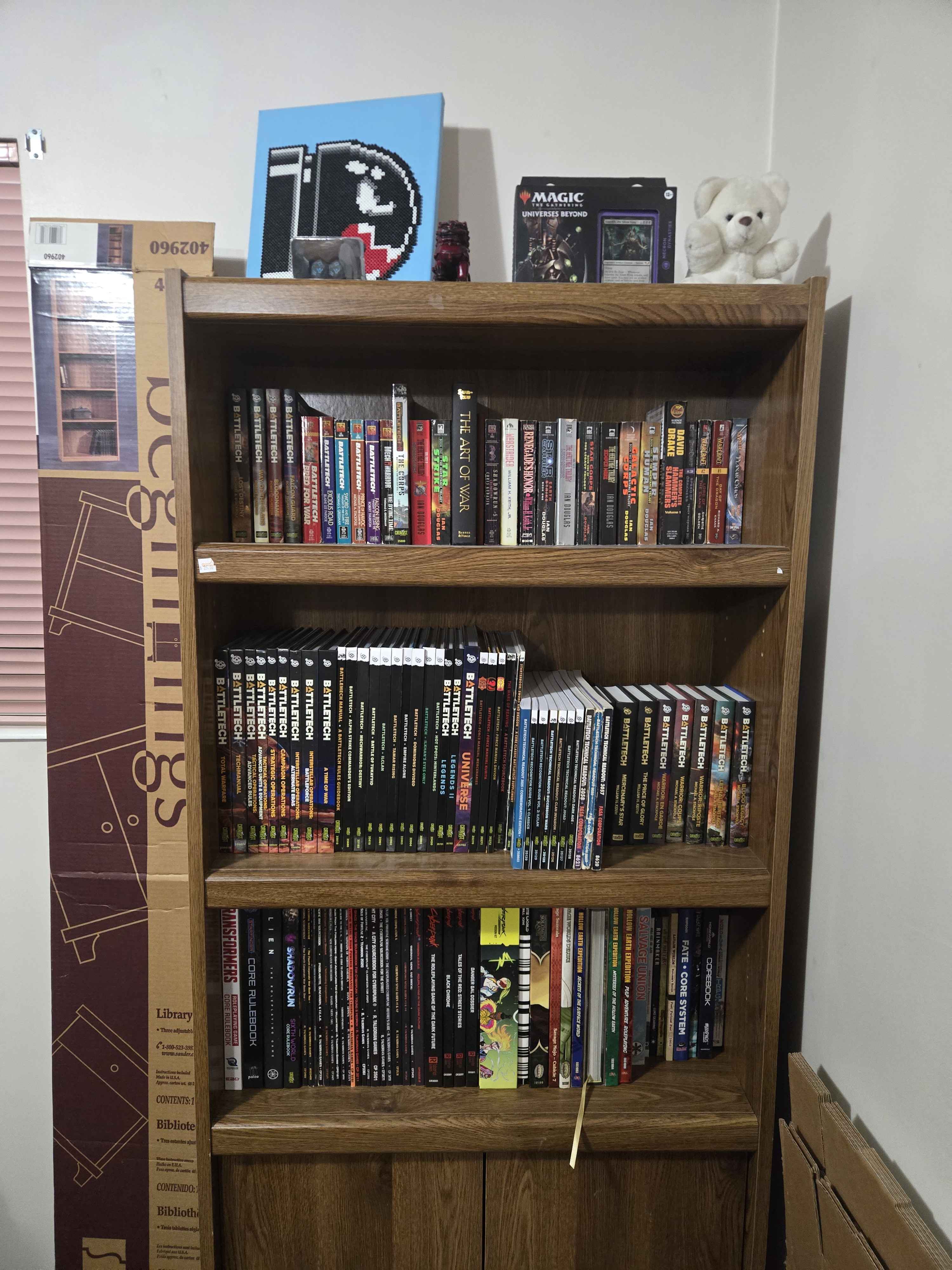 Most of my Battletech and random RPGs i've been trying to collect over the years. Its been really hard to get my hands on some of the old shit, but once I get more I'm going to get that other shelf built and ready to go for it.