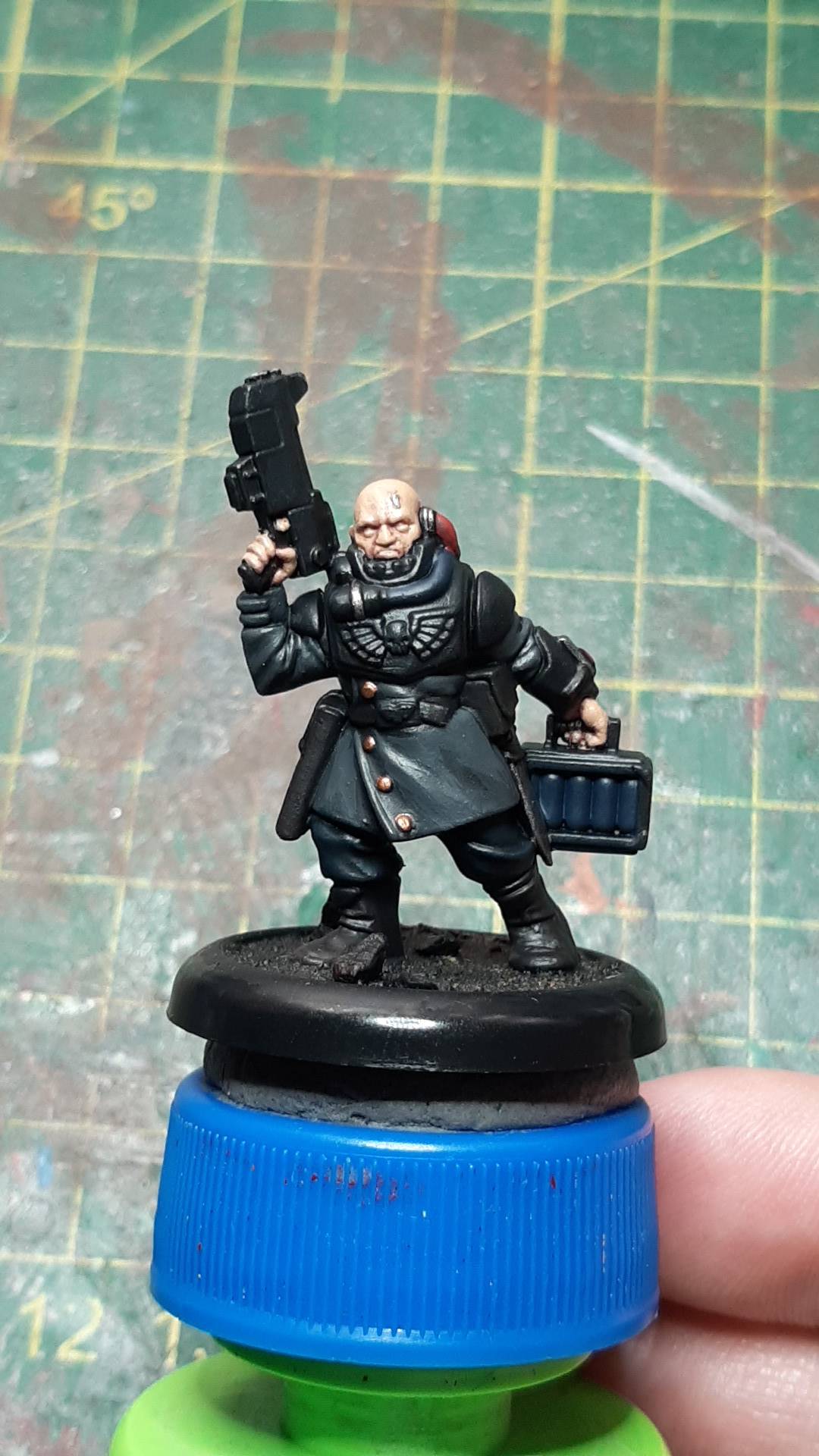 >>97856687I painted up 2 things last weekend, an Imperial Missionary from 40k who I'm using between necromunda(Redemptionist or Cawdor leader) and classic Warzone(Brotherhood Watcher, Missionary, or some kind of inquisitor) as well as an objective marker. I'm painting up a series of models to use as V.I.Ps in any kind of capture/rescue kind of mission. I'll show the V.I.P figure first, it's an old Lt. Varrus figure I've had since I got my copy of Battle for Macragge, I painted him in dark, neutral colours because in this instance he's a government spook. He still needs a bit of volume highlighting and his case of canisters needs definition and some highlighting.