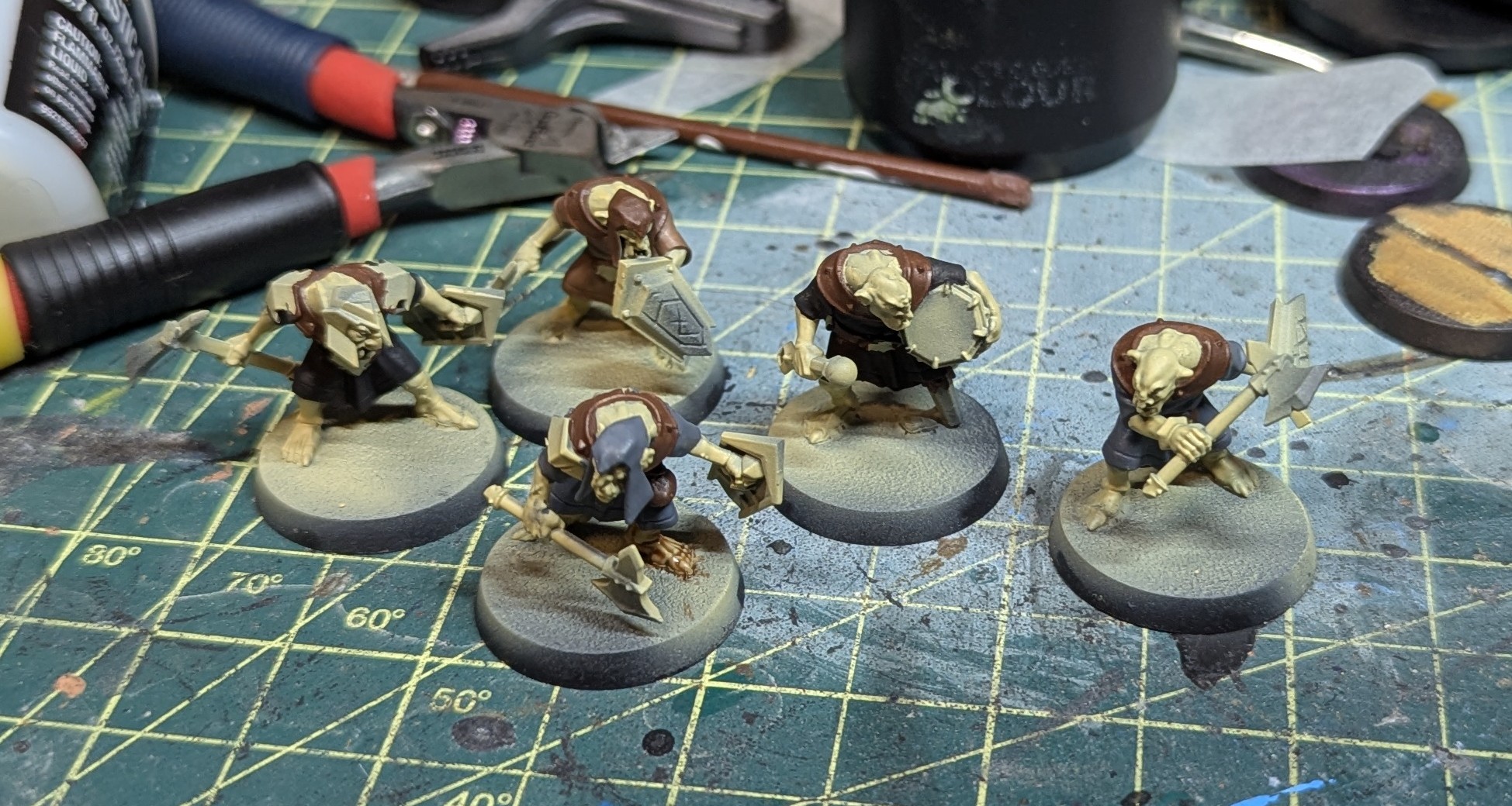 Started painting my hobgrotz. Lots of airbrushing today for the whole unit, now I'm onto brushing with 5 at a time.Clothes and leather basecoats are down for these 5, did a little test on one of their feet to see how this new skin basecoat will look, which I think turned out good.