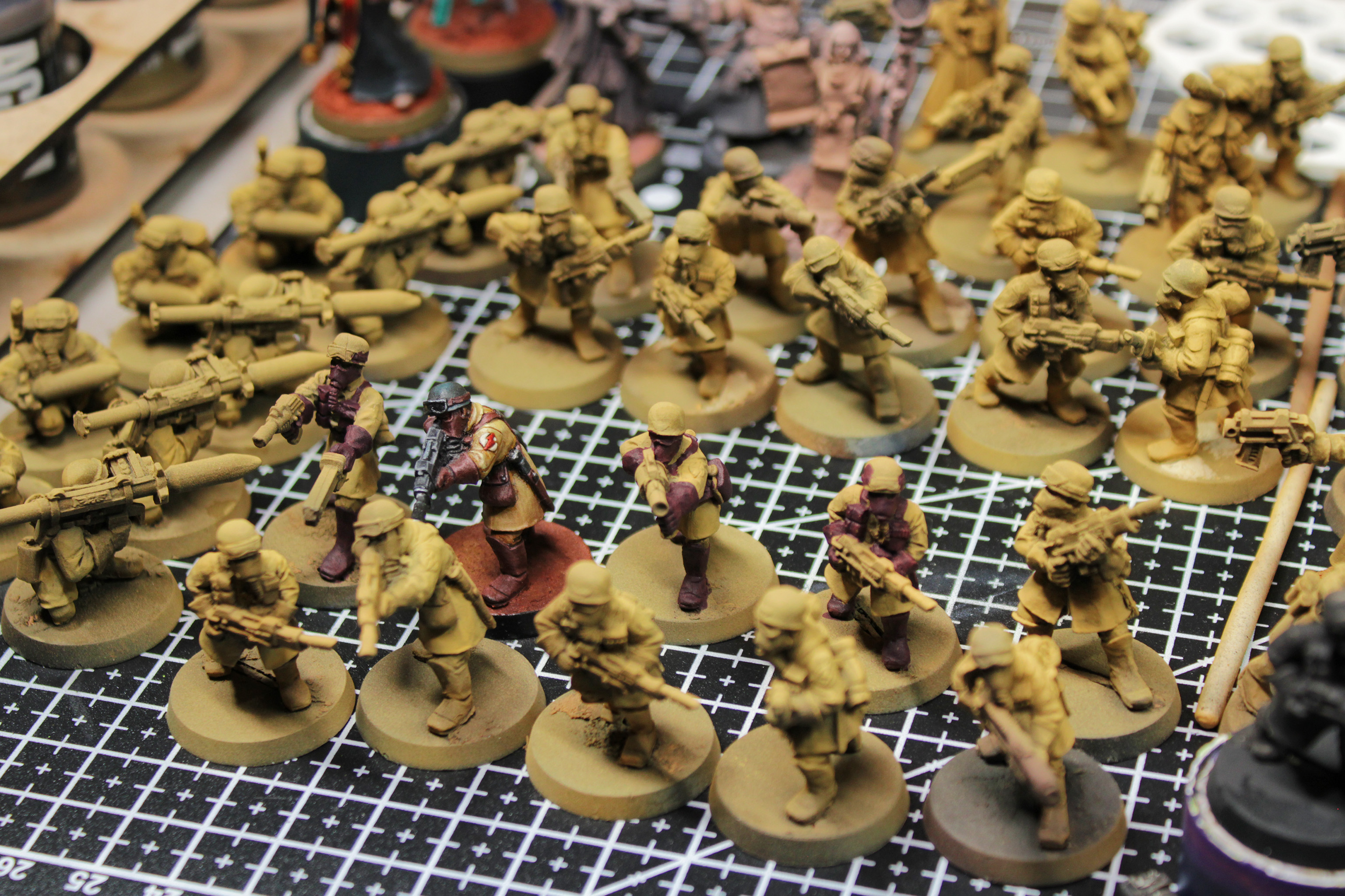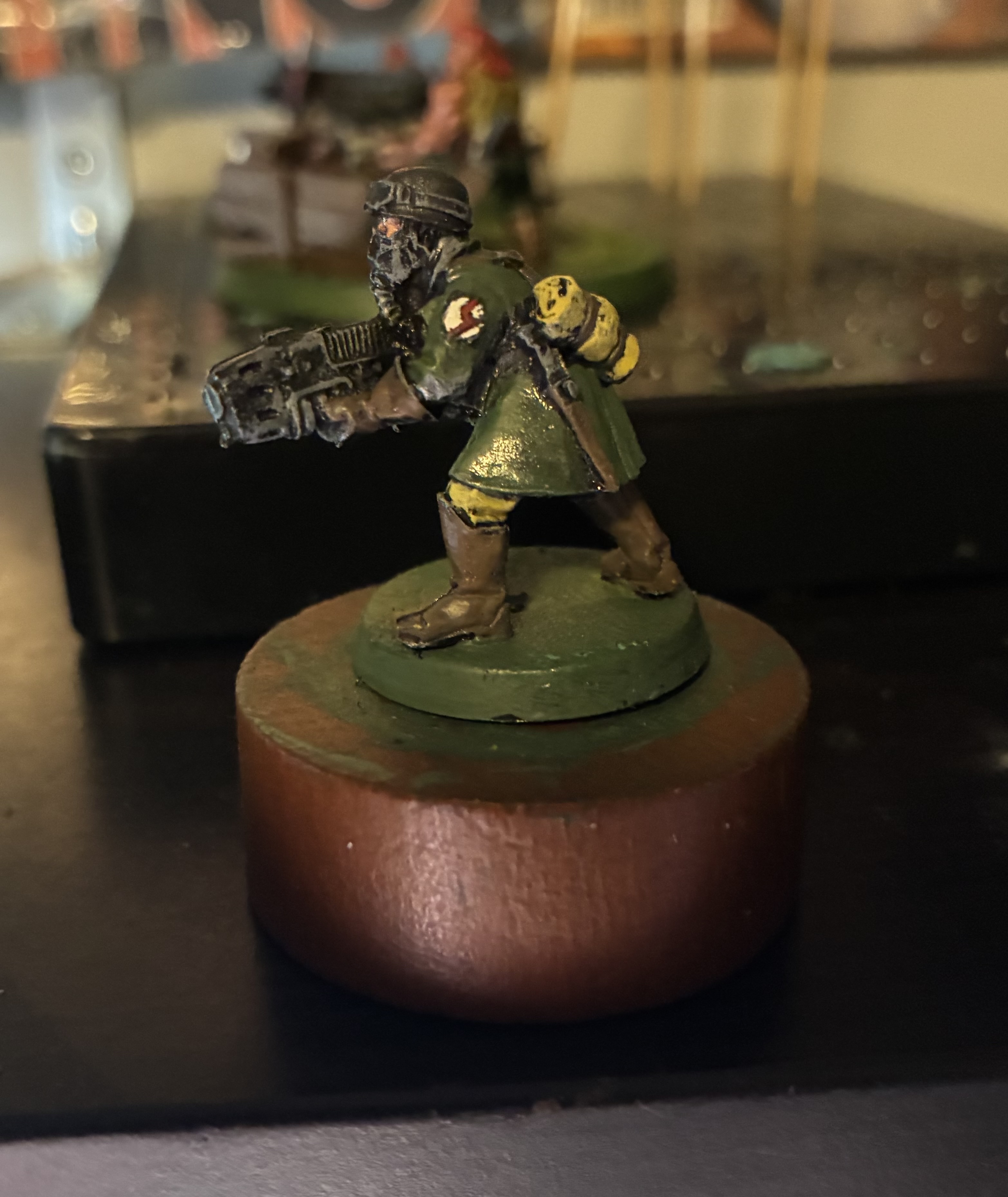 >>97861128Done with the fist, letting him dry. After not painting for nearly a year my brush control has gone to shit (understandably), and I forgot how much the pale yellow overpowers everything else. Managed to erase most of the nice transitions I had, something to keep in mind. Felt good to paint though, just need a few more practice minis before I get back to the kommandos.