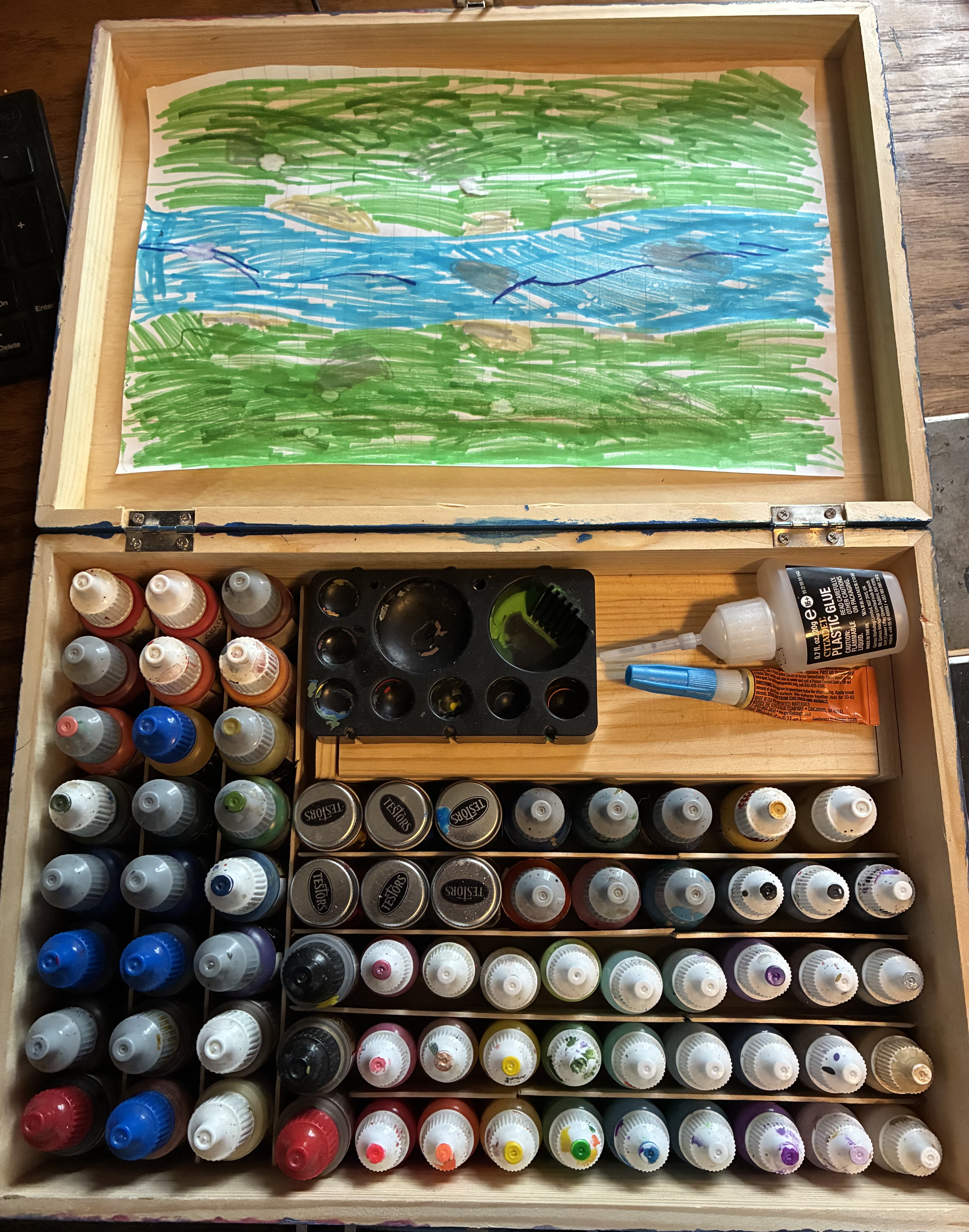 >>97858239How do you guys organize your paints? I got this box from hobby lobby on sale and glued in some popsicle sticks as dividers, I was able to fit a pencil box for brushes and this works for me since I travel for work