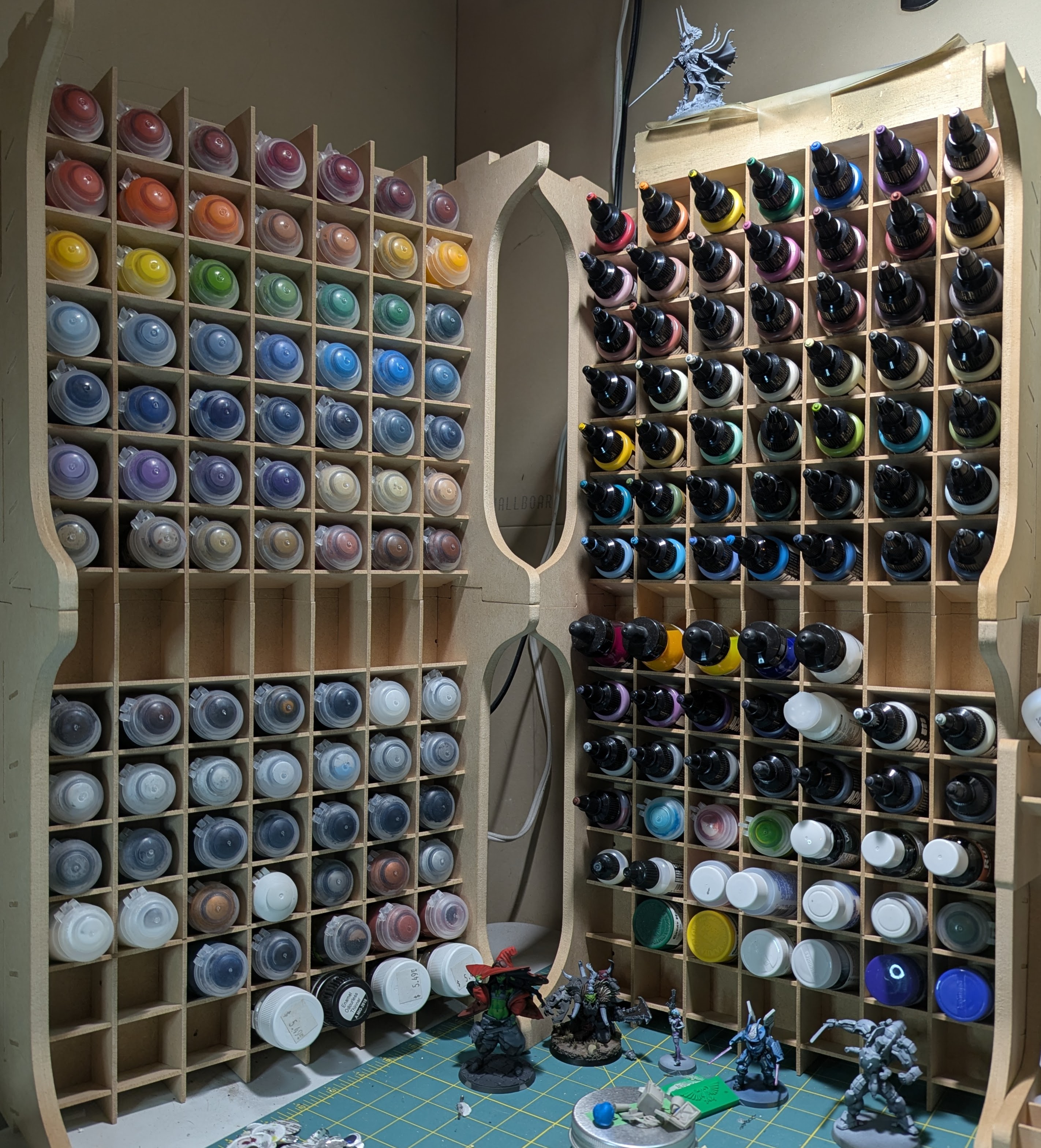 >>97861563My wife got me these MDF racks for Christmas one year. They're great for organizing my paints; my only wish is that I had a better way of identifying exactly which colour is which. Because I am seated and as tall as I am, I can only see the tops of the bottles on the lower tiers of the racks.I should try labeling the tops, maybe at first with cheap round "garage sale" stickers, but ideally I'd like to paint something on the top of each one for "at-a-glance" identification.