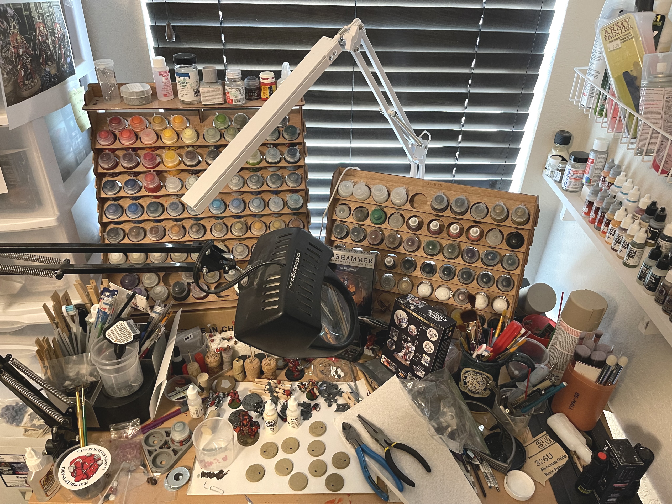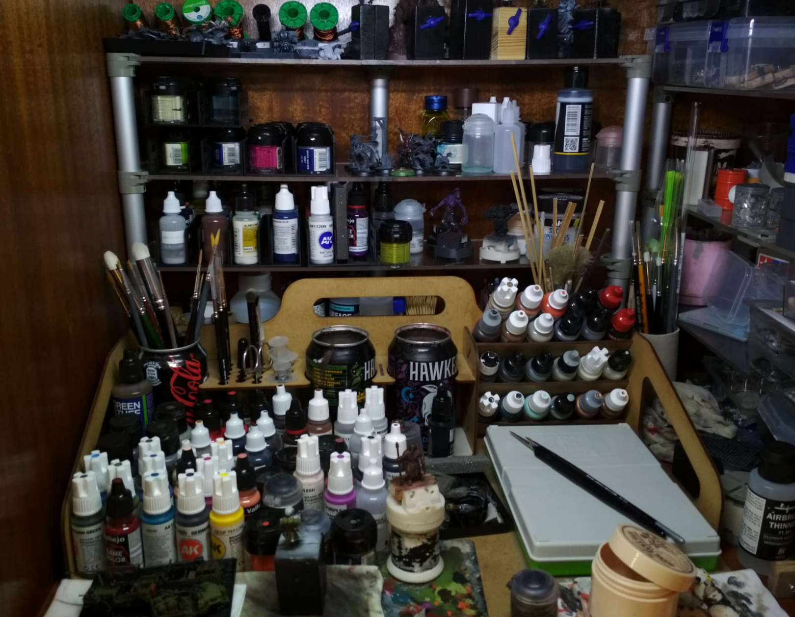 >>97861563That's a cute box. I would like to come up with a compact/mobile setup one day for when I'm eventually homeless or living out of my car.I have racks, there's these ones, and another one with smaller sections for vallejo-sized bottles.