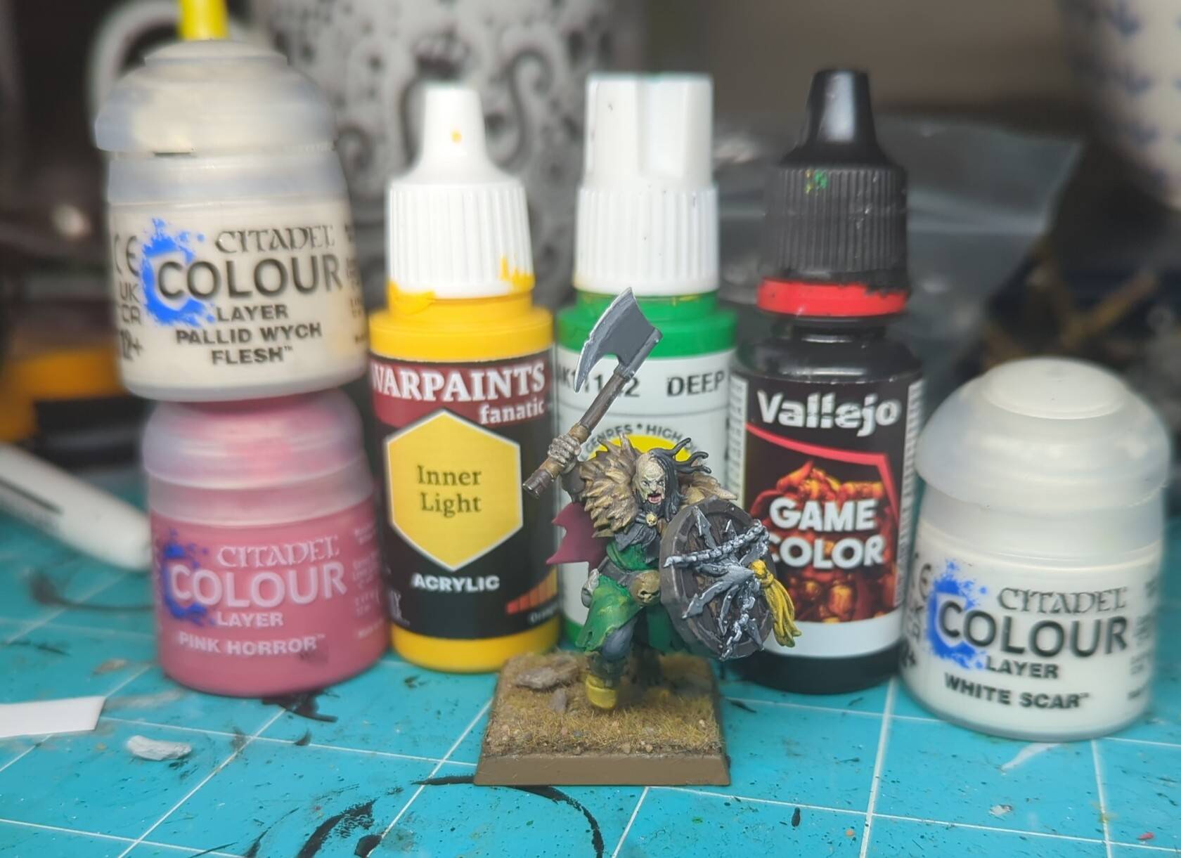 Doing a painting challenge/competition and it's been fun.Got sent a random mini and 4 random paints and had to do the whole thing with those paint plus a pure black and white. The ones I got are in the backIt's not finished but it's getting there.