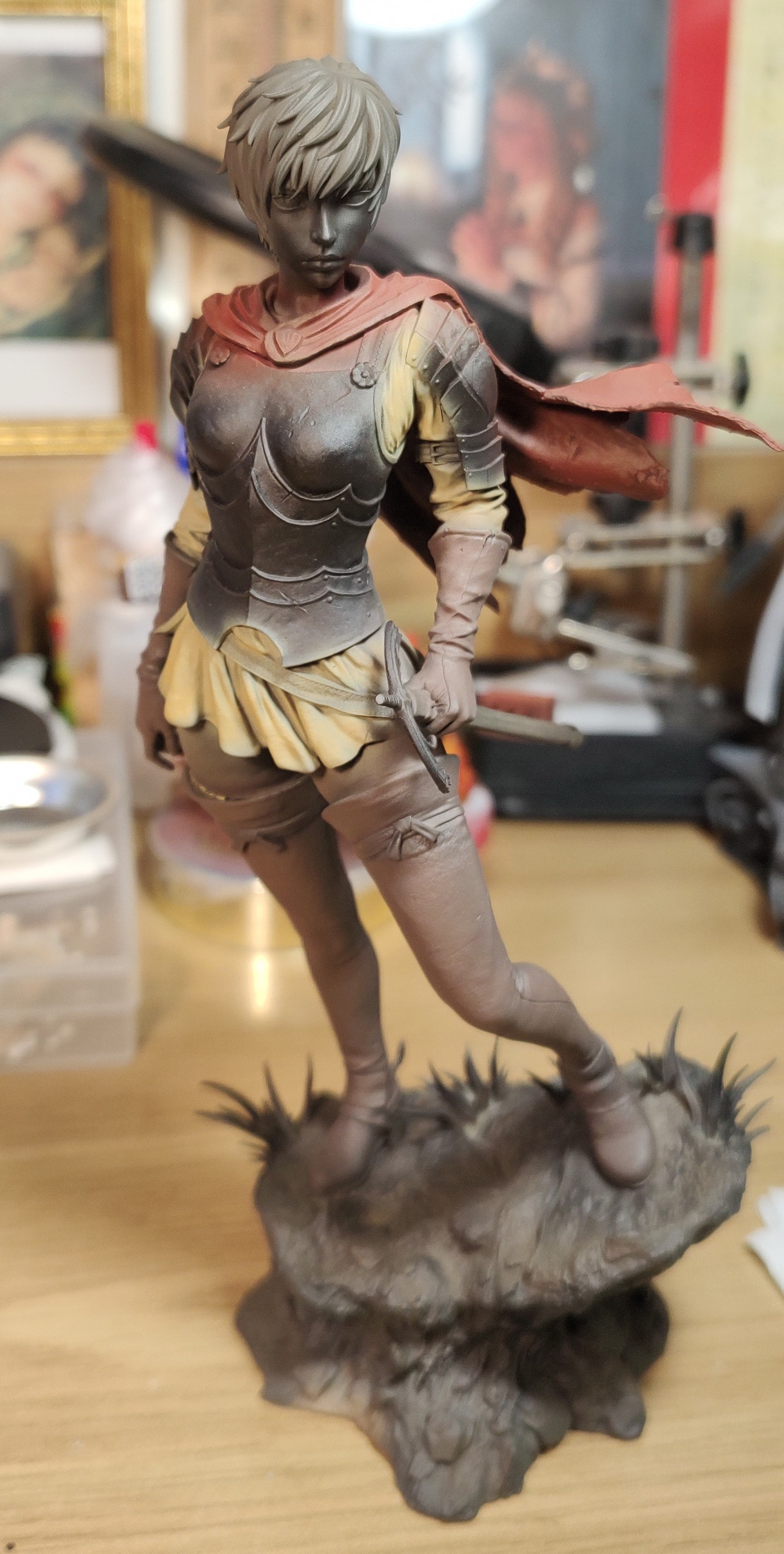 >>97865478Actually I did managed to glue her back in but since I acted like some autistic kid in fit of rage, I simply didn't posted results when she was back in one piece. Sort of one piece since sword handle was not yet glued back, due to how thin it is and impossible to pin. Likewise added some weights to her "base" to prevent future accidents since she is, as you can see, rather unstable. I wonder if people, who prepare models for 3D printing take these problems into consideration at all.I must also say that, despite my problems with cleaning (at least I know it's cleaning since spraying itself work just fine - then again, I thinner it really significantly, easily 3:1 thinner:paint, there were some grainy effects on paper so maybe it does separate at this point, AK acrylics by the way), I'm honestly surprised by how precise airbrush can be. Even with my obvious lack of skills, I could pinpoint lightly colored underclothes with minimal spraying around and avoiding staining red cloak. Granted, my only experience previously was Chinese model that sprayed rather wide but still. Maybe that Evolution was not expensive waste of money after all.