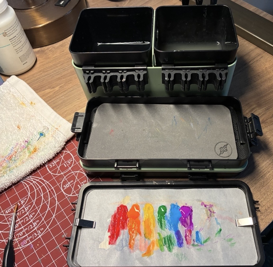 >>97861166Just the case to help keep the palette steady and my desk somewhat clean. The palette is a piece of corrugated cardboard with a piece of parchment paper tacked down with a few drops of elmers glue.