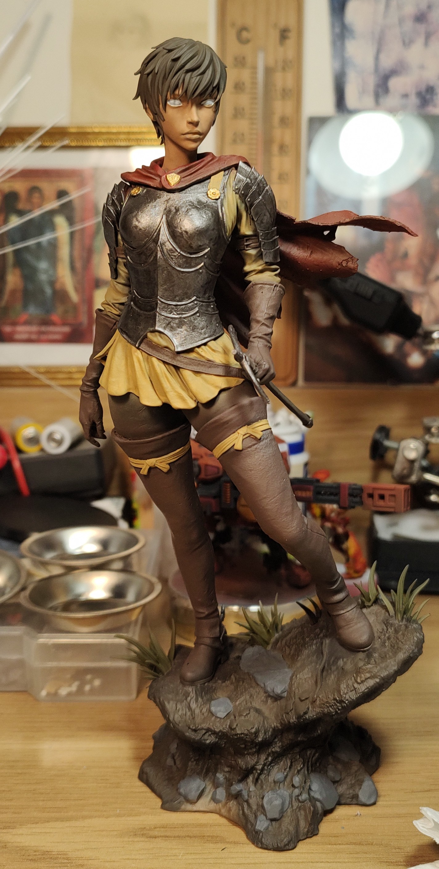 >>97865478Actually I did managed to glue her back in but since I acted like some autistic kid in fit of rage, I simply didn't posted results when she was back in one piece. Sort of one piece since sword handle was not yet glued back, due to how thin it is and impossible to pin. Likewise added some weights to her "base" to prevent future accidents since she is, as you can see, rather unstable. I wonder if people, who prepare models for 3D printing take these problems into consideration at all.I must also say that, despite my problems with cleaning (at least I know it's cleaning since spraying itself work just fine - then again, I thinner it really significantly, easily 3:1 thinner:paint, there were some grainy effects on paper so maybe it does separate at this point, AK acrylics by the way), I'm honestly surprised by how precise airbrush can be. Even with my obvious lack of skills, I could pinpoint lightly colored underclothes with minimal spraying around and avoiding staining red cloak. Granted, my only experience previously was Chinese model that sprayed rather wide but still. Maybe that Evolution was not expensive waste of money after all.