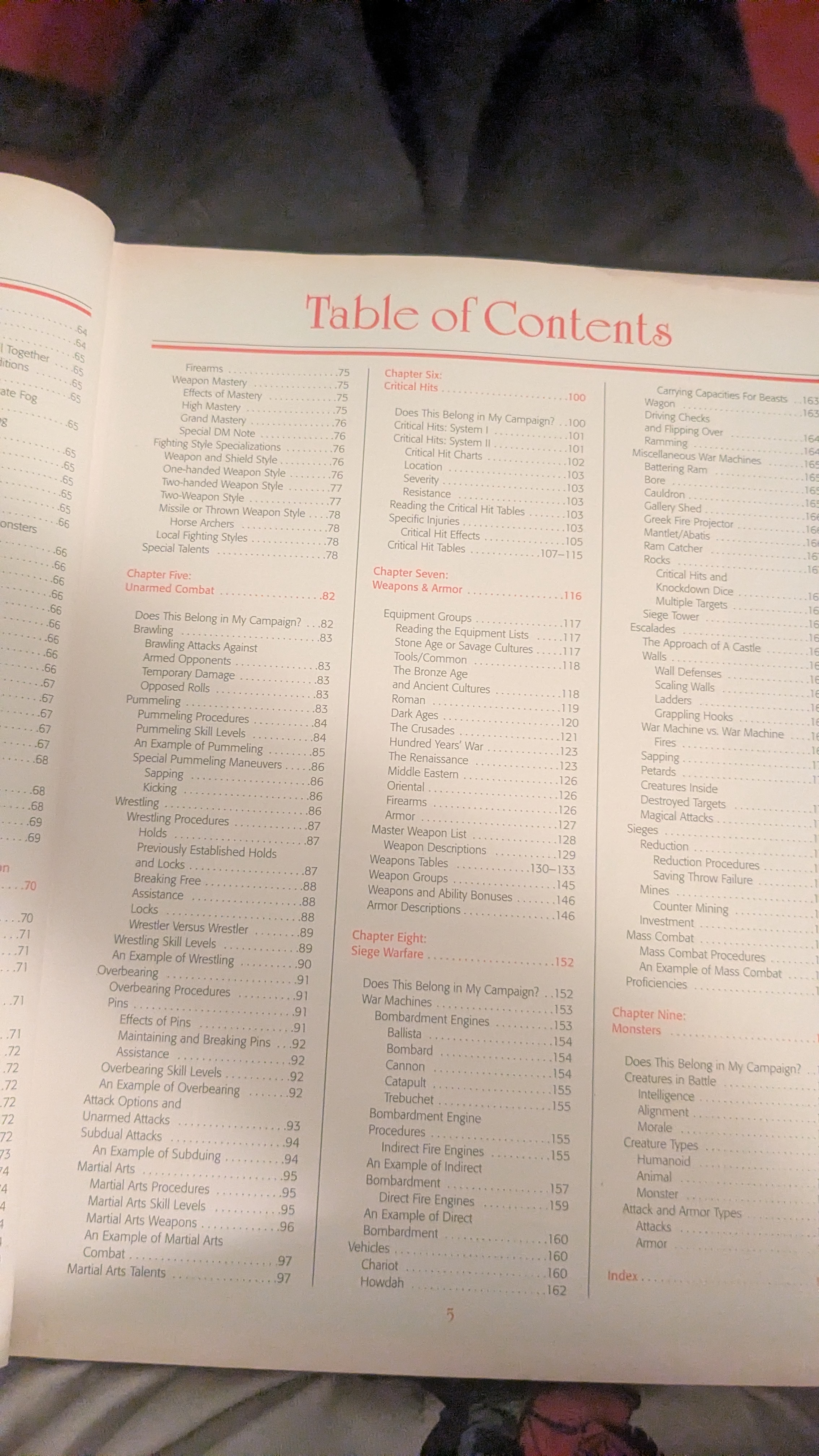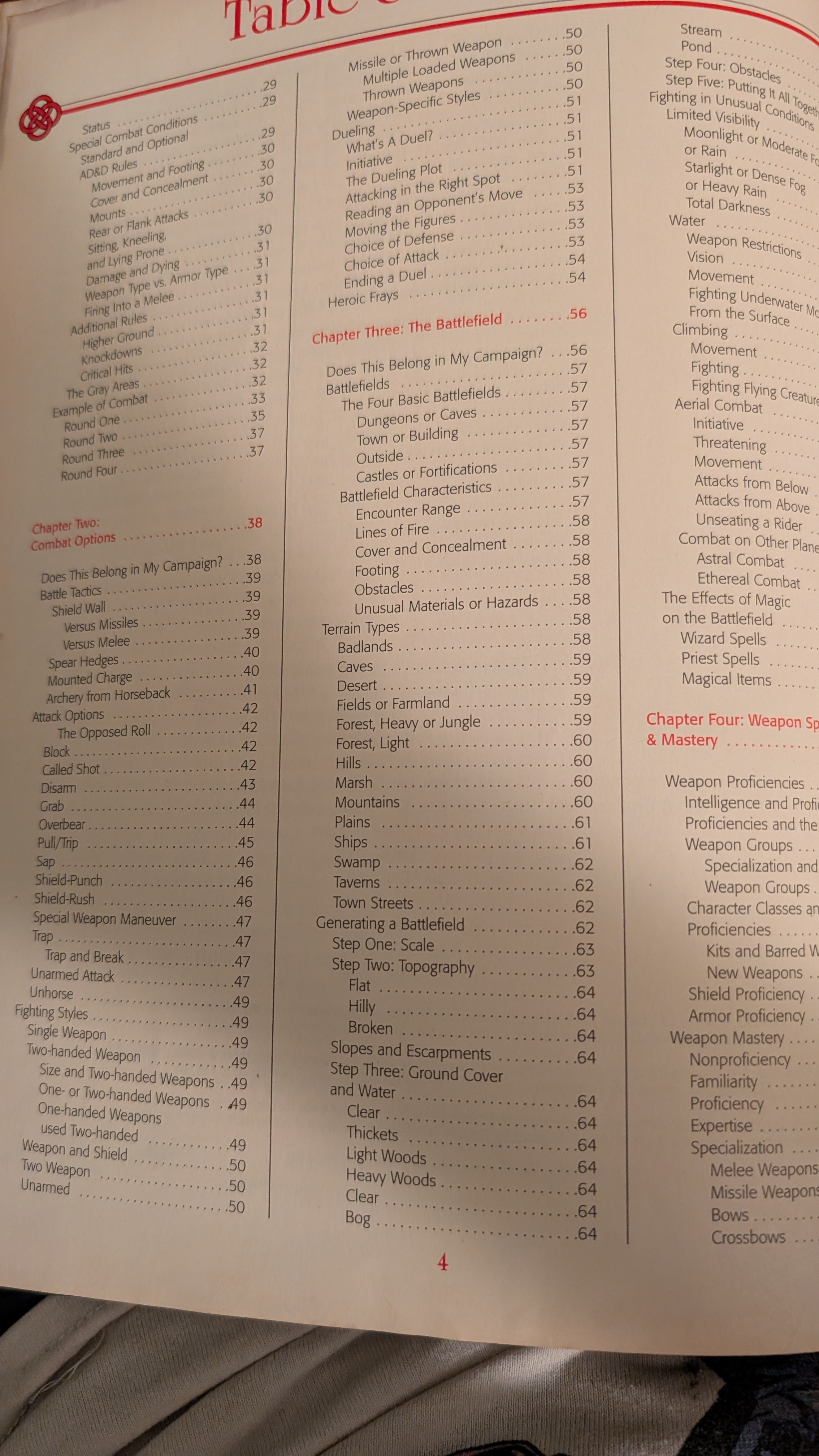 Third page TOC. I think I like the chapter about monsters the best. Any chapters stand out to you guys? Chapter 4 Weapon Specialization & Mastery is the first chapter most players looked at first but the chapters covering weapons & armor (ch 7) and siege warfare (ch 8), 22 pages long, were pretty chill and useful. Actual siege warfare rules were few and far between. The weapons and armor section covered the Iron Ages, the Bronze Age etc, as you can see for yourself