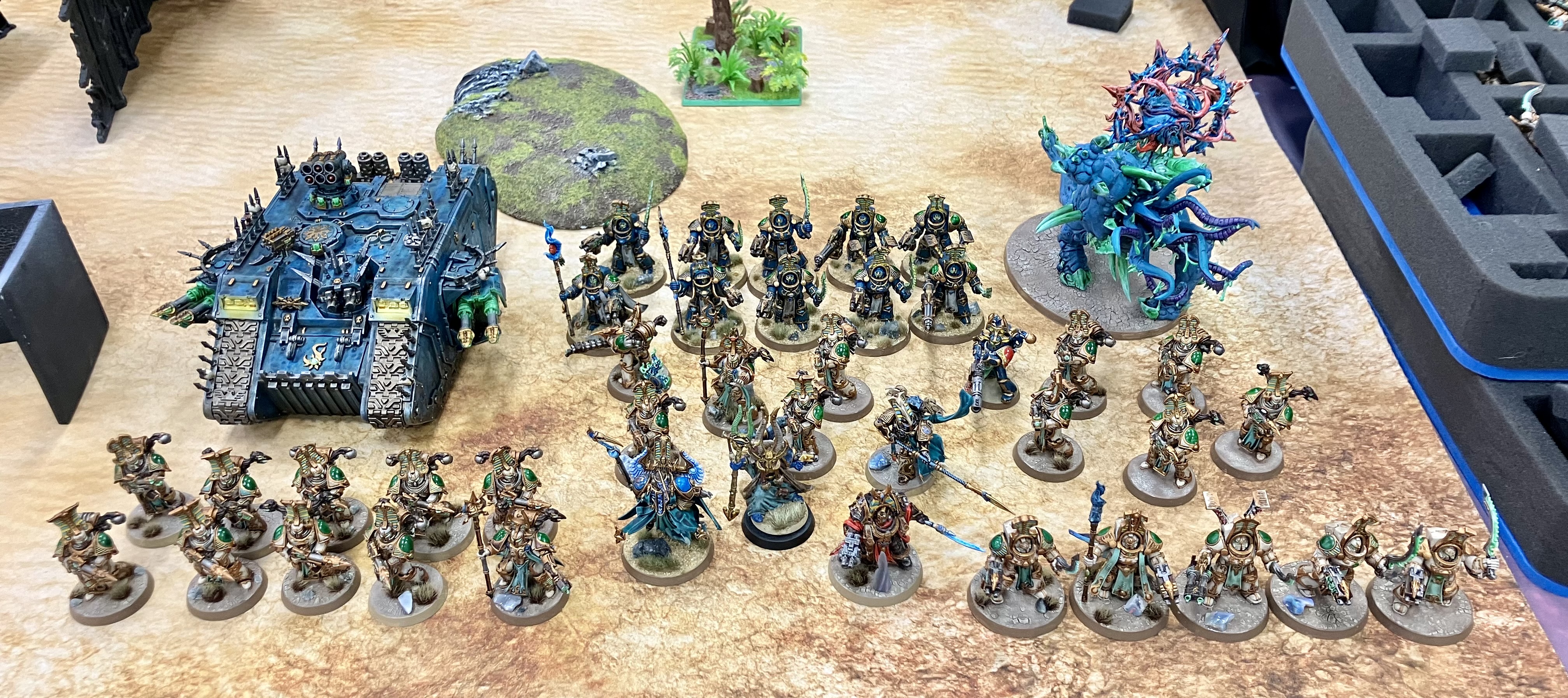 Yes it is my army. I have had it for a long time now and have beautiful opals I cut and polished based on it to make it have a warp esque appearance or some shit idk. Lol. I have mixed feelings about 2 different color schemes. The blue is older and the tan is more recent work of mine. Granted the thousand sons are very fractured so it’s not unusual for different color schemes warbands to operate together. The tan was supposed to be cult of time and the blue Ahrimans followed.