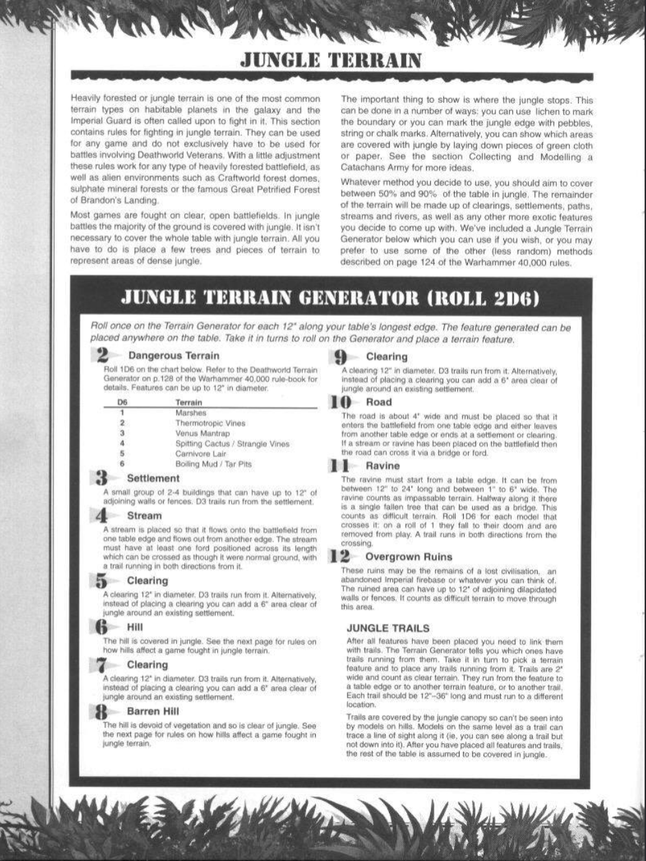 >>97864253>Blue terrain is certainly going to be impassable, but the yellow pieces are probably difficult terrain? Meaning infantry can run over it at a penalty while vehicles can just run over it. I doubt there will be difficult terrain tests but it would be cool.3rd and 4th edition's area terrain pretty abstract. The new terrain rules don't seem like much of a departure from those older editions. In 4th edition for example, it didn't actually matter what was in the foot print of the terrain feature. Features like Trees, bushes, wreckage, or ruins were really just there as a physical reminder of the terrain type. You didn't concern yourself with the actual location of the features beyond where your models could physical rest. This meant that you could freely move through the foot print of the terrain piece, you could walk through solid features rather than path around them.You could shoot into area terrain, out of area terrain, but never through area terrain. Terrain gave a bonus to units occupying it. Because terrain was abstract, it made things pretty Samey. The difference between a forest and a ruined building wasn't a lot. What was physically present also didn't matter, terrain didn't need to be tall or short. They stopped shooting and provided a defensive bonus against shooting attacks. The benefit of either was very subtle.Things being kind of the same though allows for a lot of creativity and possibility. The requirements for a good piece of terrain were so much less. Making your own terrain from every day house hold items was the norm back then. You could have jungle terrain, ruined cities, ice planet terrain, and what ever else you can think of and at the end of the day you could play an enjoyable and thematic game on it. You weren't going to get your shit pushed in because you were playing in the swamp themed table rather than the cities of death themed table. Hopefully this is the way forward. Pic related.