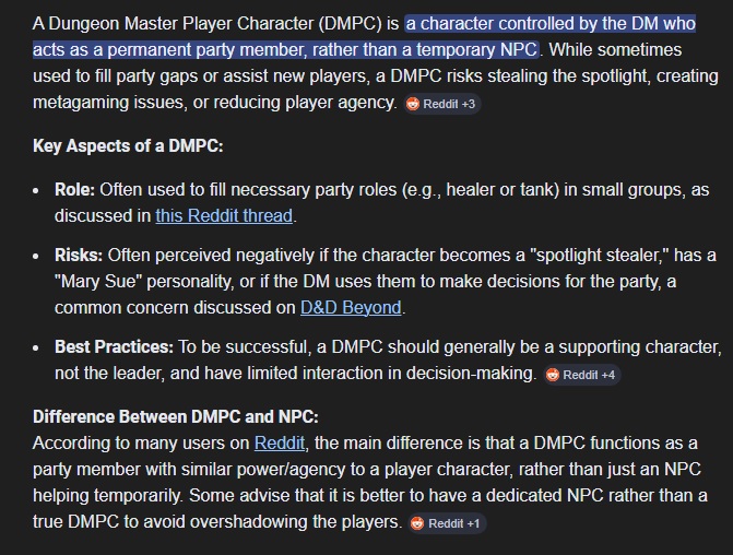 >>97867349a DMPC is a player character that is in the party, it can last for more than one session, it could be an entire campaign where the DM gets to play a character too, so you're just wrong, this isn't a discussion about NPCs.