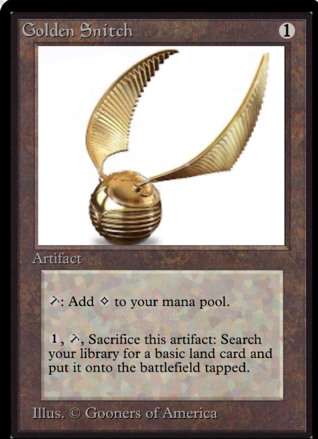 >>97868386exactly. it would be like the One Ring for Harry Potter. Massive in-game utility, near auto include for all colors except green (and thats a good thing!) which adds balance to most formats + massive value coomlector wise as well. it would be a mythic rare I imagine. its the golden snitch it wins you the game in HP (this won't alone in MTG, but its flavorful). I was actually thinking of making it cost (0) to be a true Mox callback but thought the fixing was strong enough as it is.
