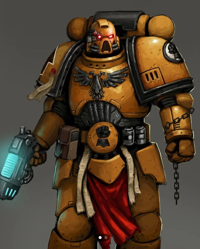 I'm thinking of painting an Imperial fist for fun with black trim instead of red.Does anyone per chance paint IF? I know they aren't popular but I like the look of yellow on black. Most guides tell you to use a pink undercoat or the IF yellow contrast paint but pic rel has a really neat ochre undertone.For painting the pants on marine scouts would a warm earthy brown (think steel legion drab), olive drab green, khaki, or grey-blue work best?desu I'm still looking for inspo through pics or artwork