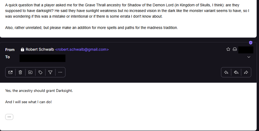 >>97892948>lol, even while lying you cannot conceal your disgust for the very concept of tabletop.Tabletop is fun. I actually emailed the guy who wrote Shadow of the Demon Lord recently to ask about a rules clarification and he graciously responded. btw, Grave Thrall player characters are supposed to have darksight.>lol, you /pol/fags are so obviously here entirely to make /tg/ worse.k. Meanwhile I wonder if you play anything besides megacorp slop or really anything at all.