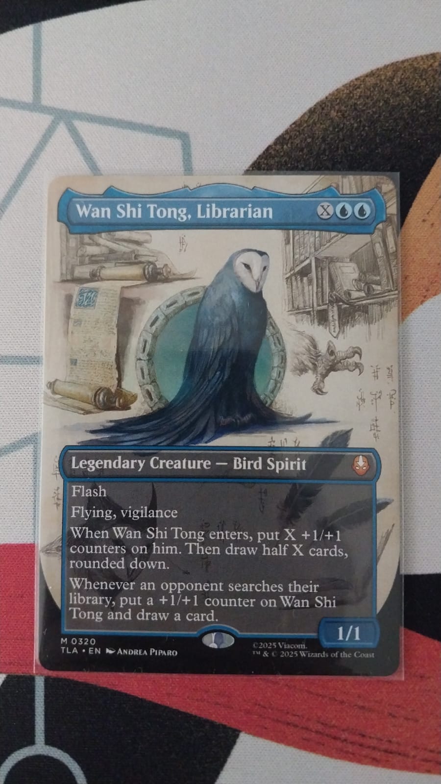 >>97888289Things that look offUnusual IP crossover“Wan Shi Tong” is a character from Avatar: The Last Airbender. While MTG does do crossovers (Universes Beyond), this specific card isn’t a widely known or documented official release.Set code and copyright lineThe bottom shows “©2025 Viacom” alongside Wizards of the Coast. Official MTG cards typically have very standardized formatting—this combo looks suspicious and not tied to a known set.Card text templating issuesThe wording (“draw half X cards, rounded down”) is a bit awkward compared to typical MTG rules templating, which is usually very precise and consistent.Print quality & finish (from image)The surface looks slightly matte/flat and the text edges aren’t as crisp as authentic cards usually are. Authentic cards tend to have very sharp printing and a specific gloss.