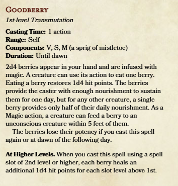 >>97897089I was debating making it "turning 2d4 berries into goodberries," but I wouldn't know the ramifications of such a change and getting 2 berries in and 4 berries out was wierd etc.>>97897168So you can use one berry for picking someone up per turn. Maybe something in the future lets you replace your attacks with the utilize action, then you can revive several players with berries, and I wanted to avoid any nonsense since it's still a first-level spell