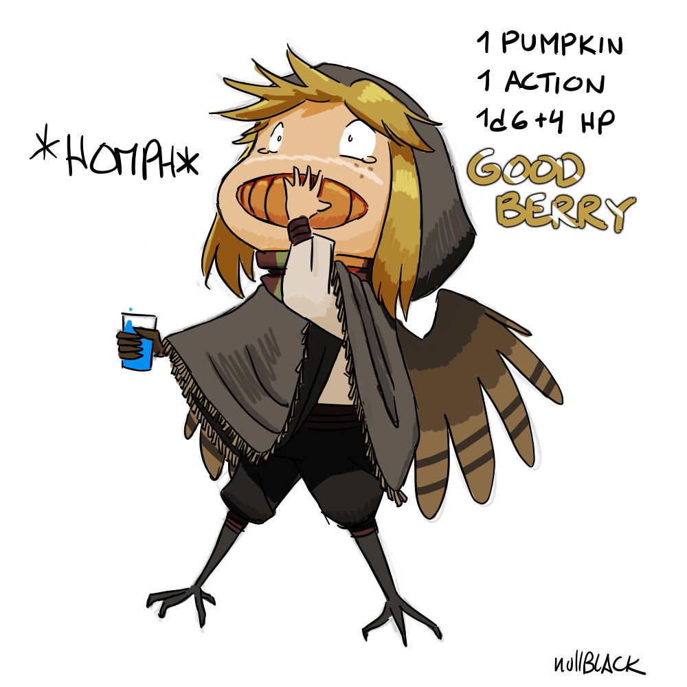 >>97897028>Thoughts on my goodberry?I think you should go back to the old form of Goodberry. It enchants ones you find, it doesn't create them. No free food, just makes limited food more filling.Though the old used to be one meal not a days worth of food, so you would need two per person.Fun Fact: Berrys also include pumpkins. How would you depict swallowing a whole pumpkin in an action? I like to think the magic makes it dissolve in your mouth. Some think more like picrel