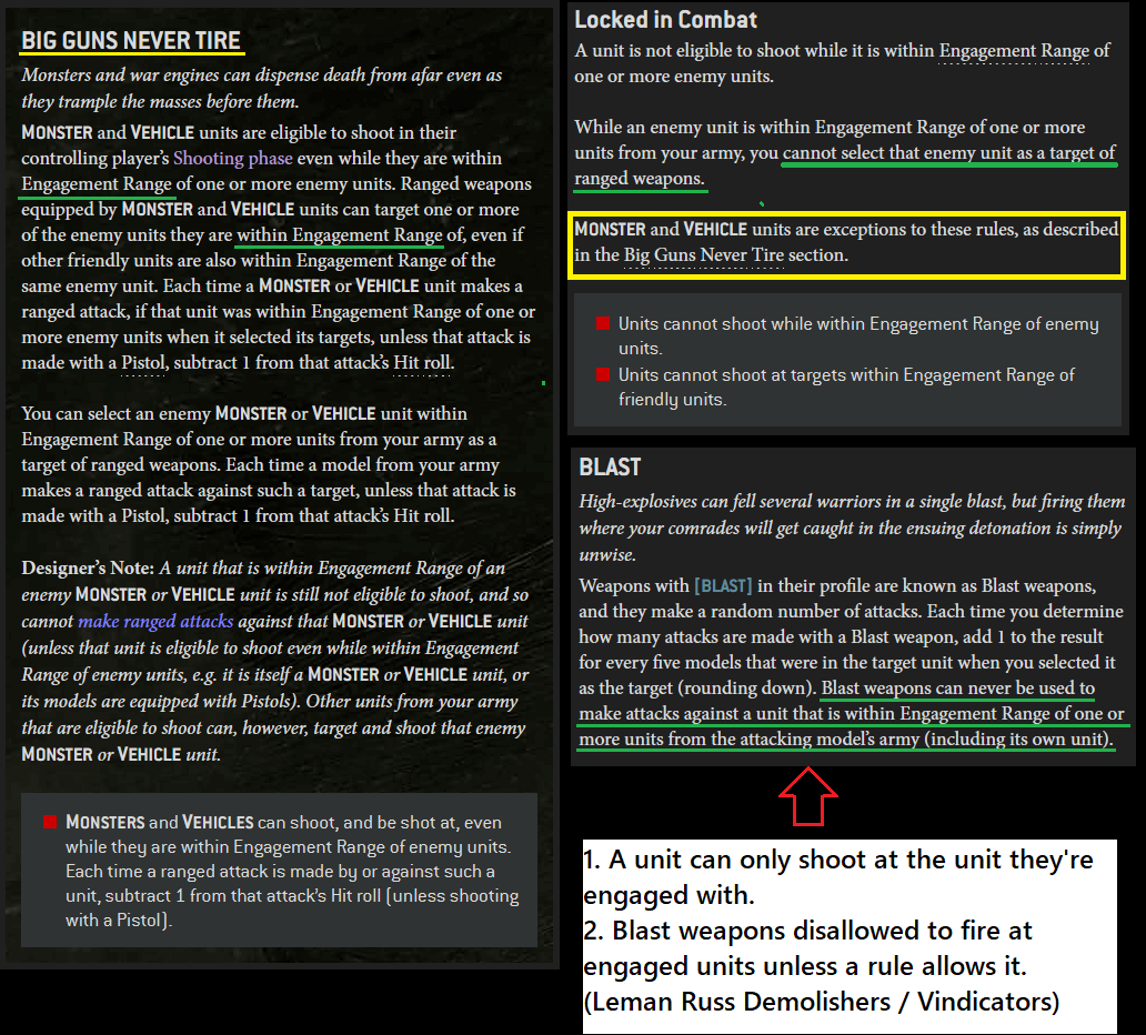 >>97900941Vehicles and monsters can shoot anything when engaged by an enemy unit, but they can't use blast weapons on units within engagement range.